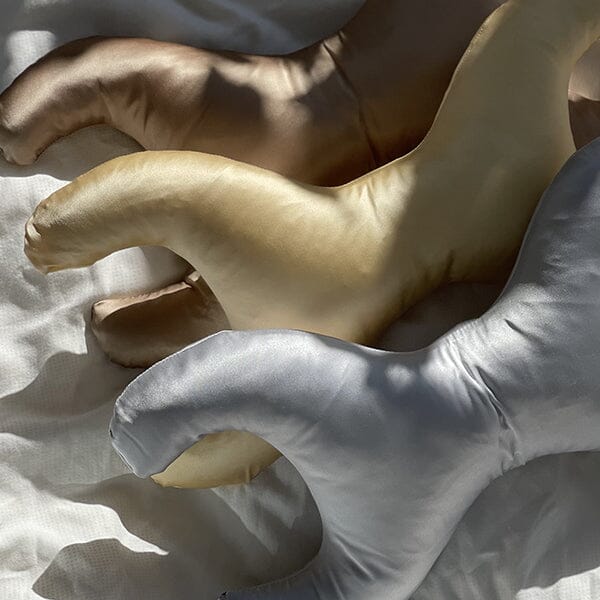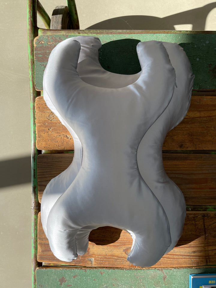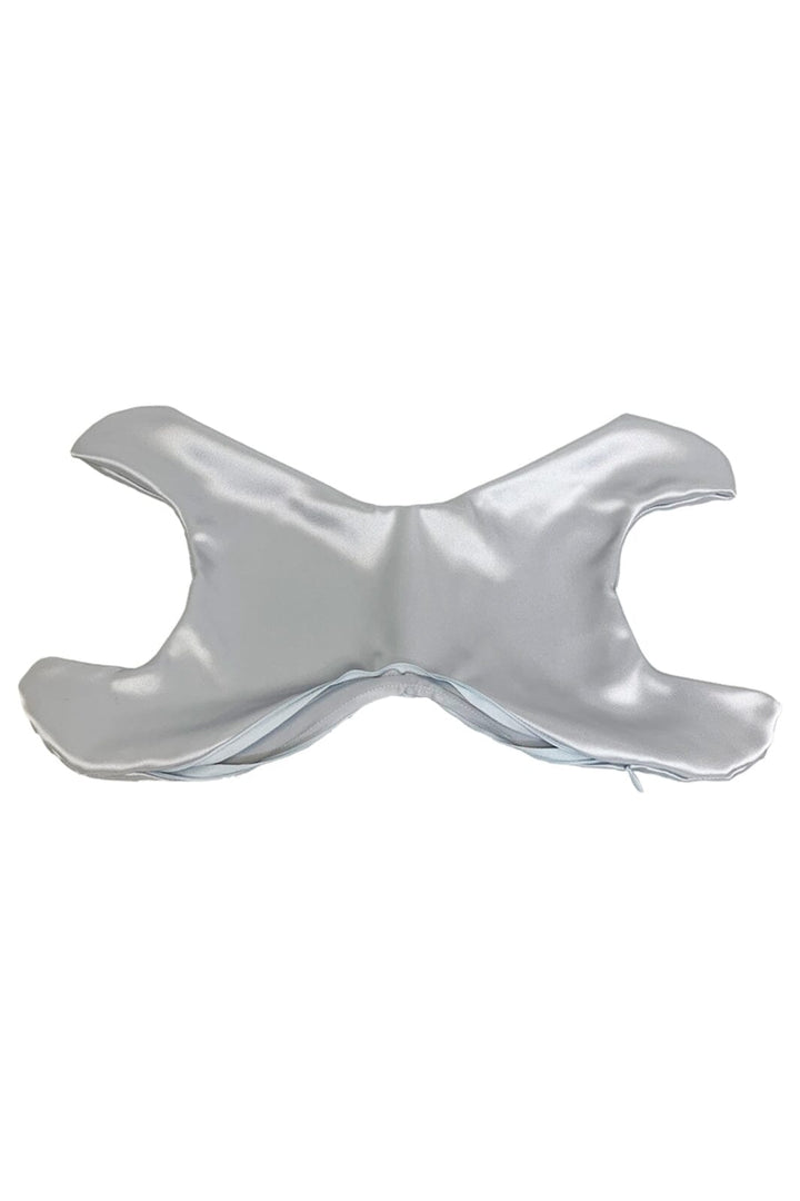 Kussensloop van Save My Face in zilverkleurige charmeuse-zijde. Het sloop heeft een glad oppervlak en is ontworpen voor het La Petite-kussen met een kenmerkende X-vorm.