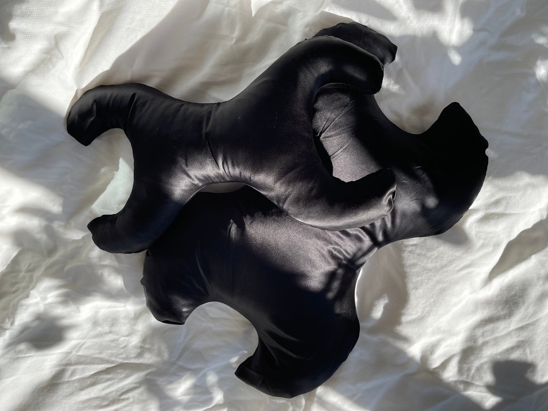Zwarte kussen van Save My Face met zijden hoes. Het kussen heeft een speciale vorm en is gevuld met synthetische vezels die bacteriënresistent zijn.