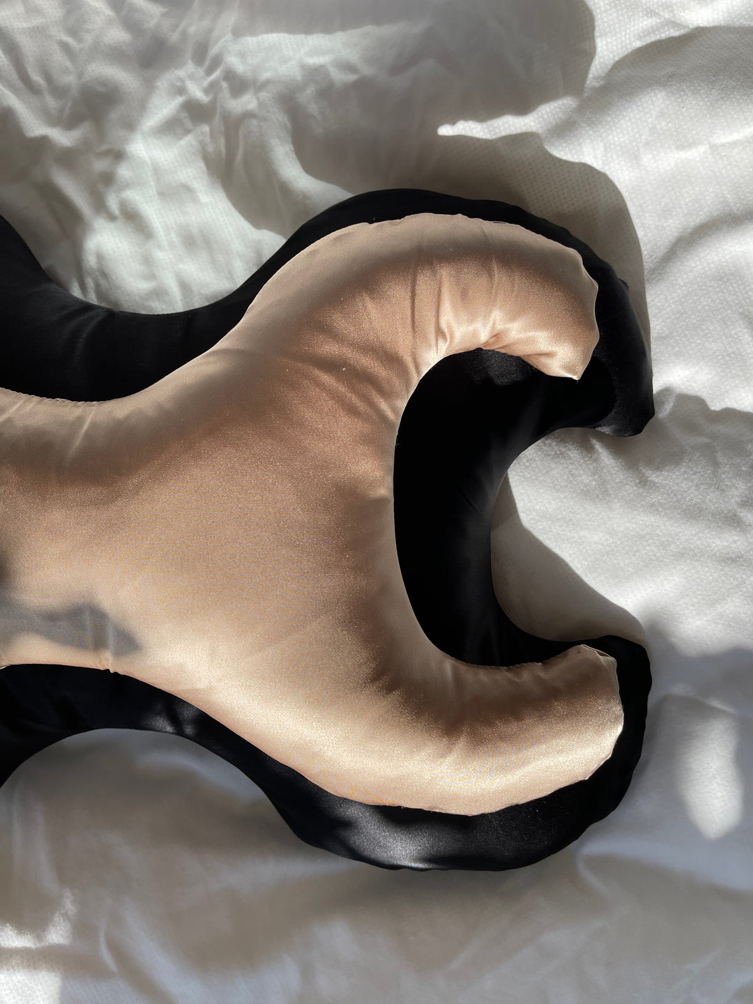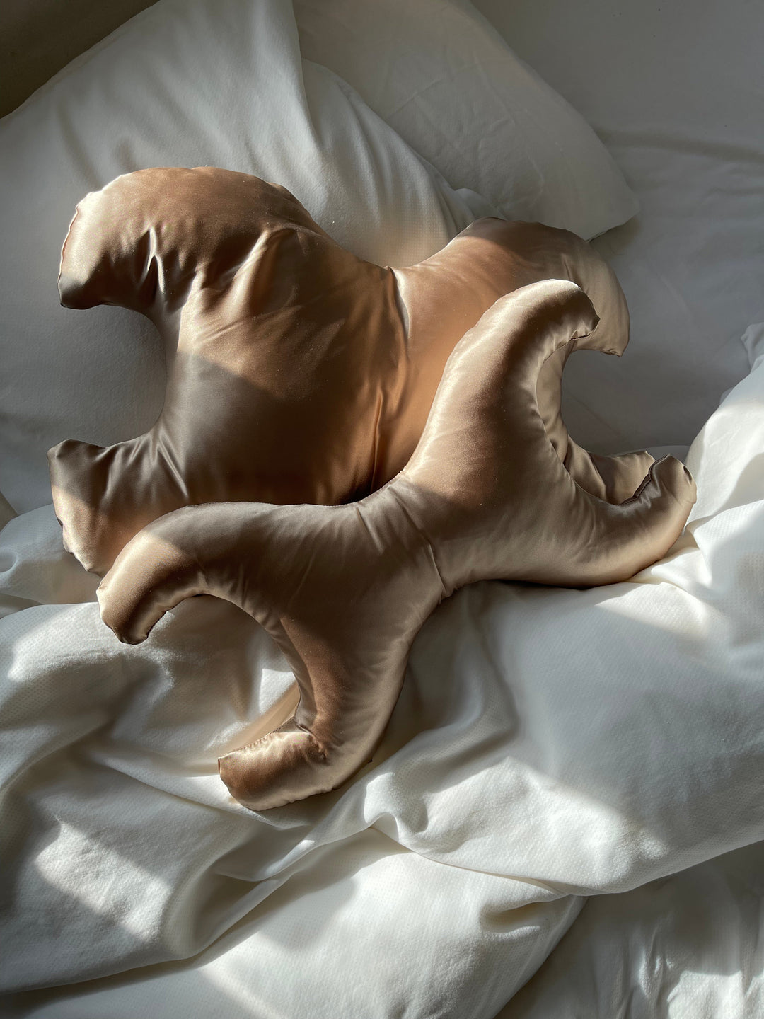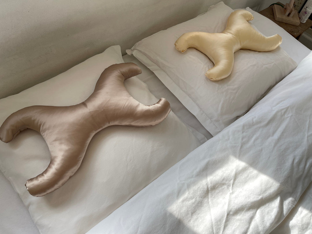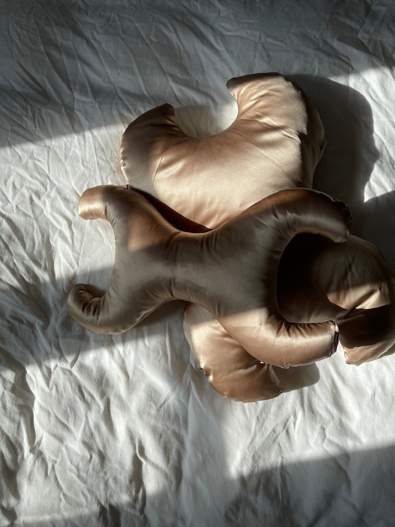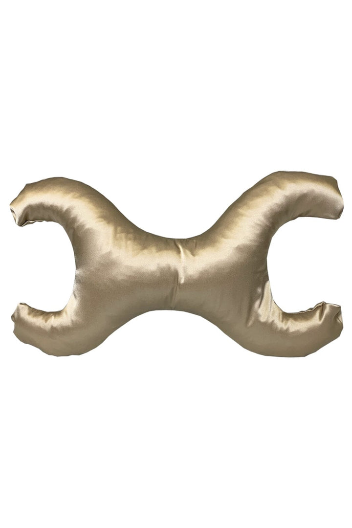 Klein kussen met bronzen zijden hoes van Save My Face. De kussen heeft een X-vormig ontwerp en combineert allergievriendelijke vezels met temperatuurregulerende zijde.