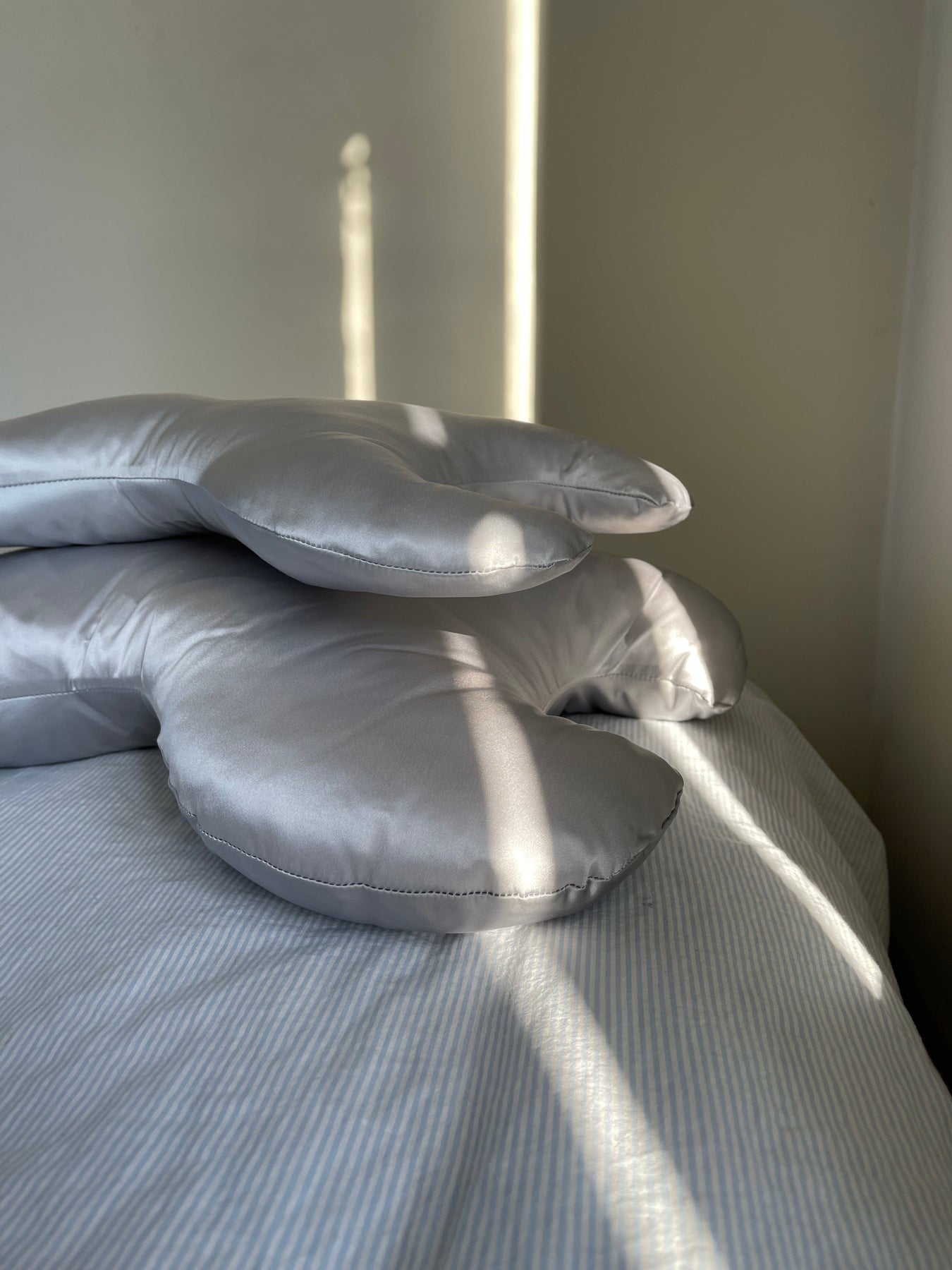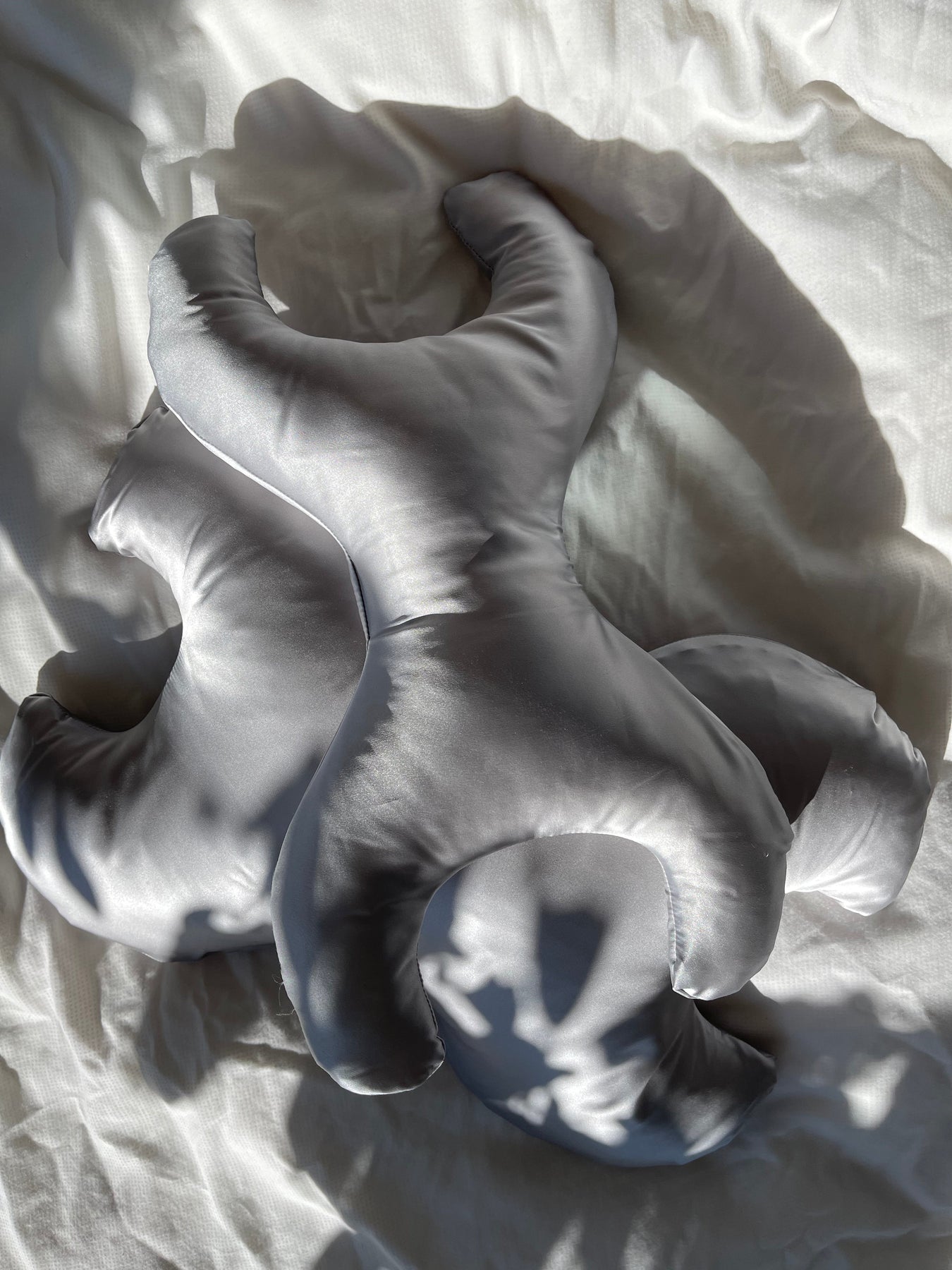 Klein kussen met zandloper vorm van Save My Face. Het zilverkleurige kussen heeft een afneembare hoes van zijde en is ontworpen om slaaprimpels te verminderen.