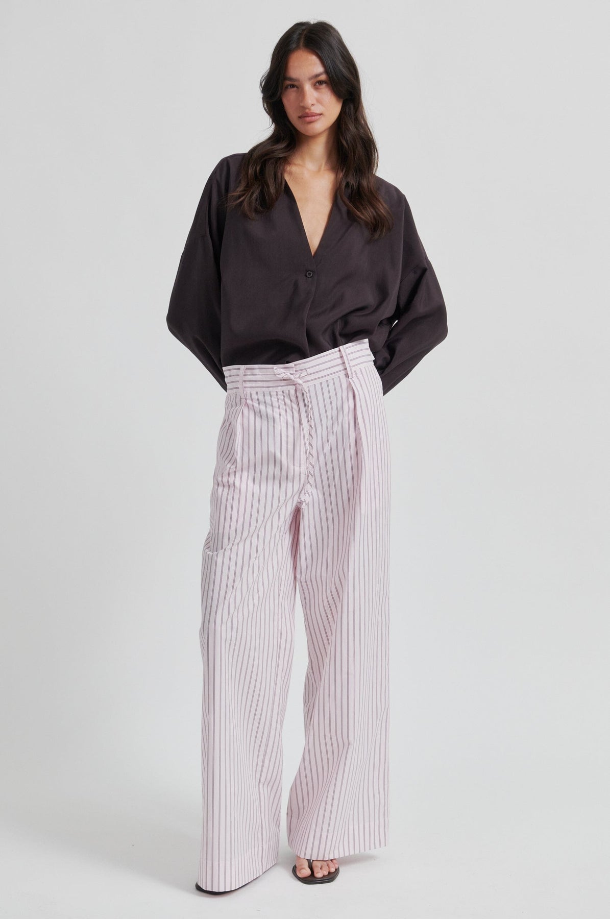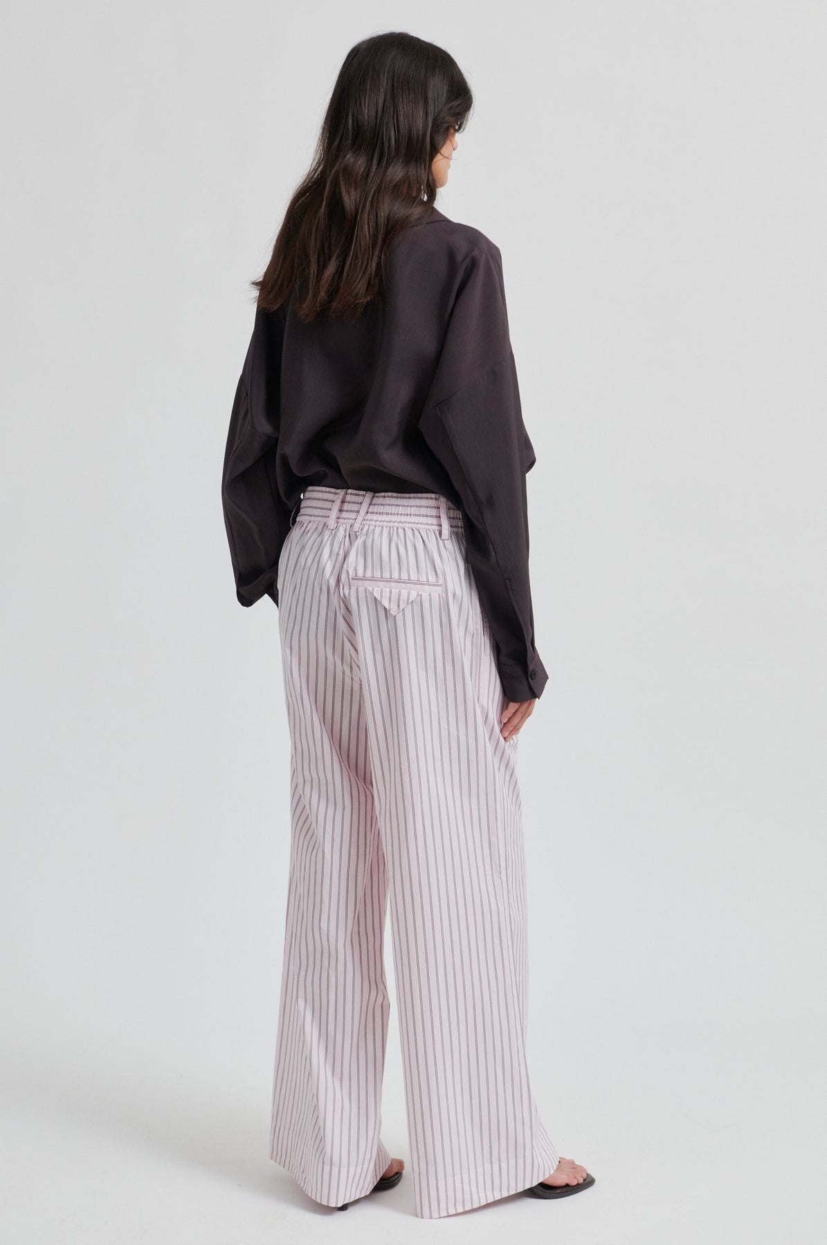 Broek van Second Female in lichtlila katoen met verticale strepen. De broek heeft wijde, rechte pijpen en een losse pasvorm.