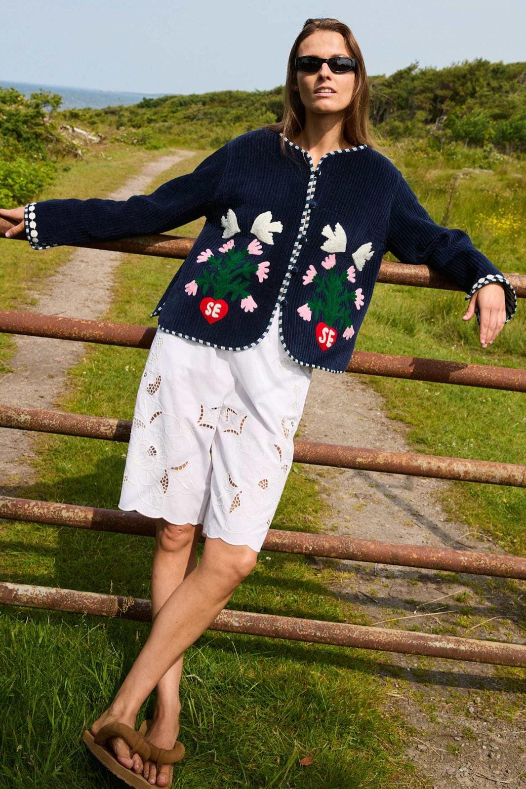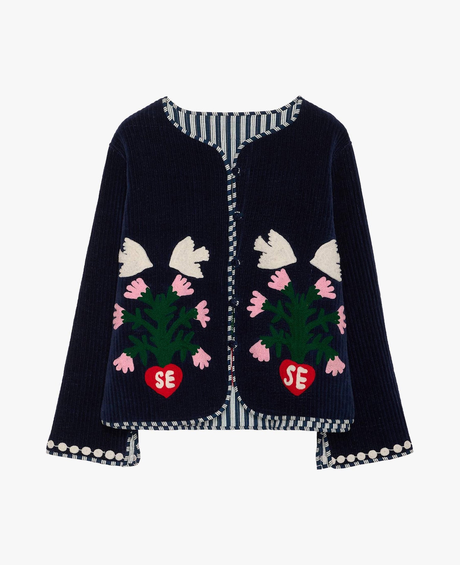 Donkerblauw jasje van Sissel Edelbo met handgemaakt Suzani-borduurwerk van vogels en een groeiend hart. Het jasje heeft lange mouwen en een losse pasvorm voor ontspannen gebruik.