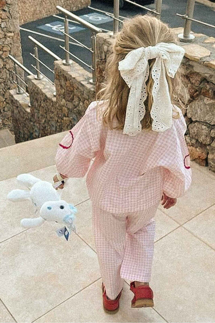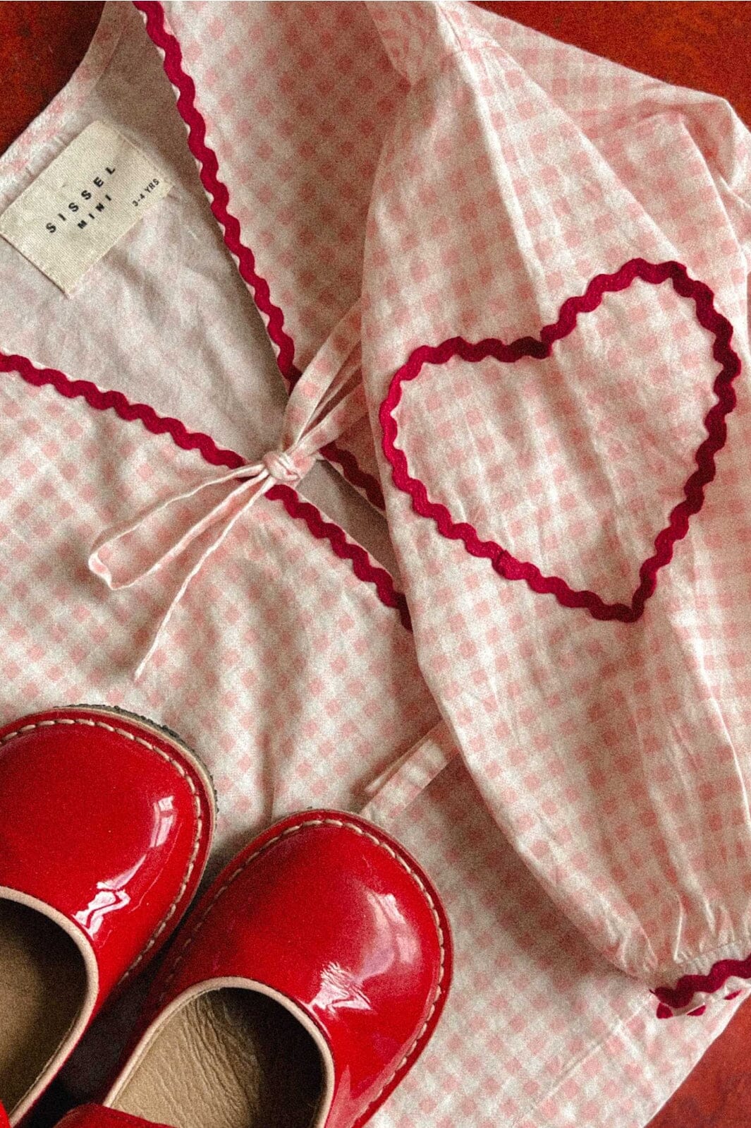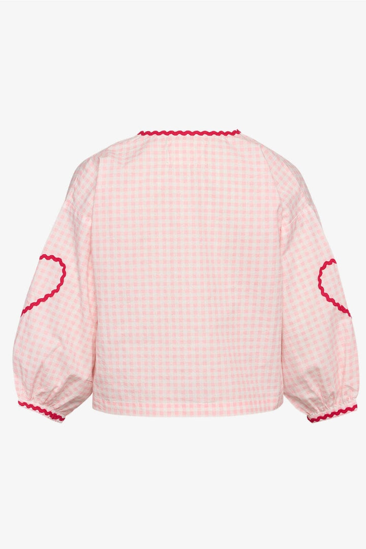 Roze geruite top van Sissel Edelbo in biologische katoenpoplin. De top heeft lange puffmouwen en hartvormige zakken met rode zigzagbanden langs de randen.