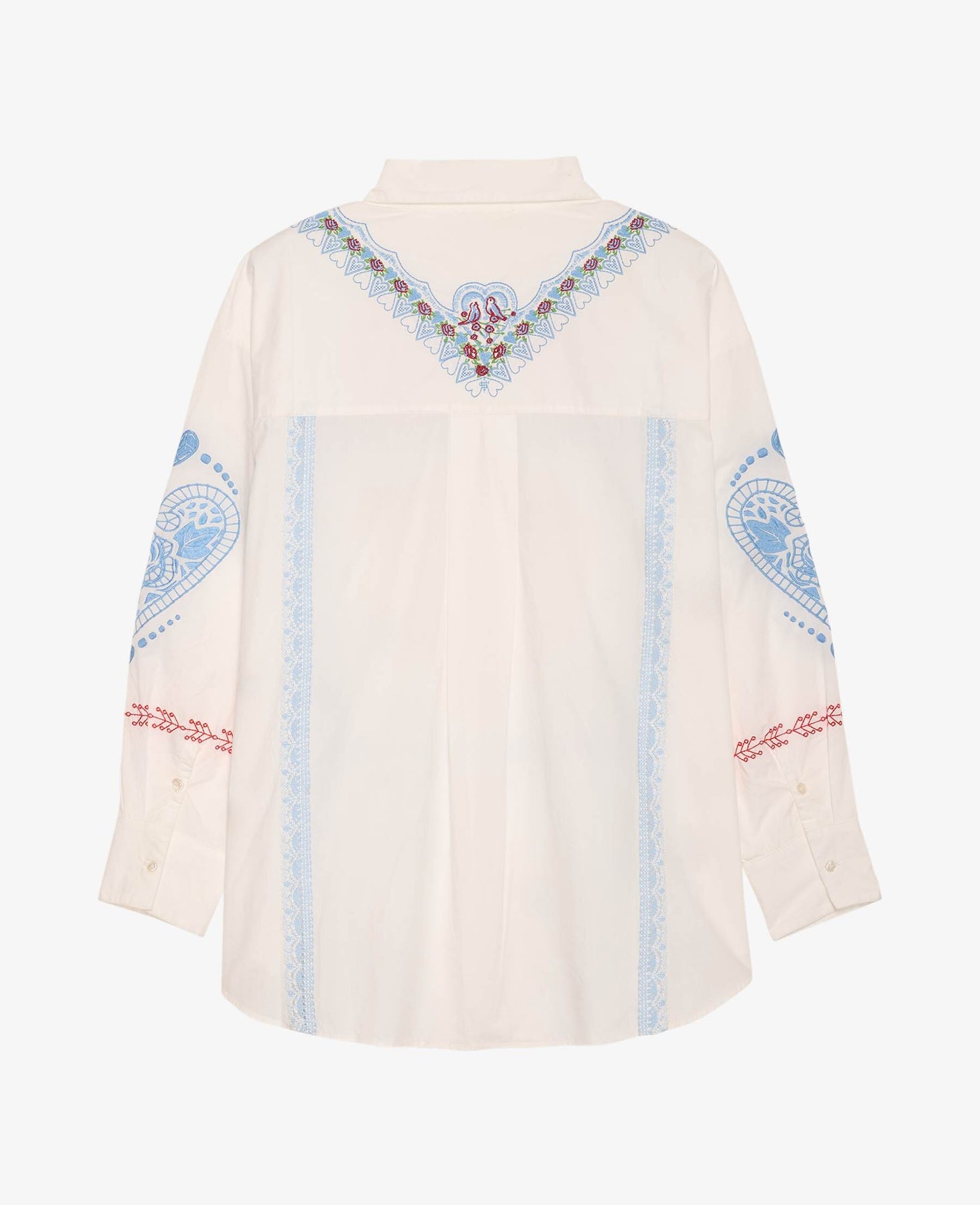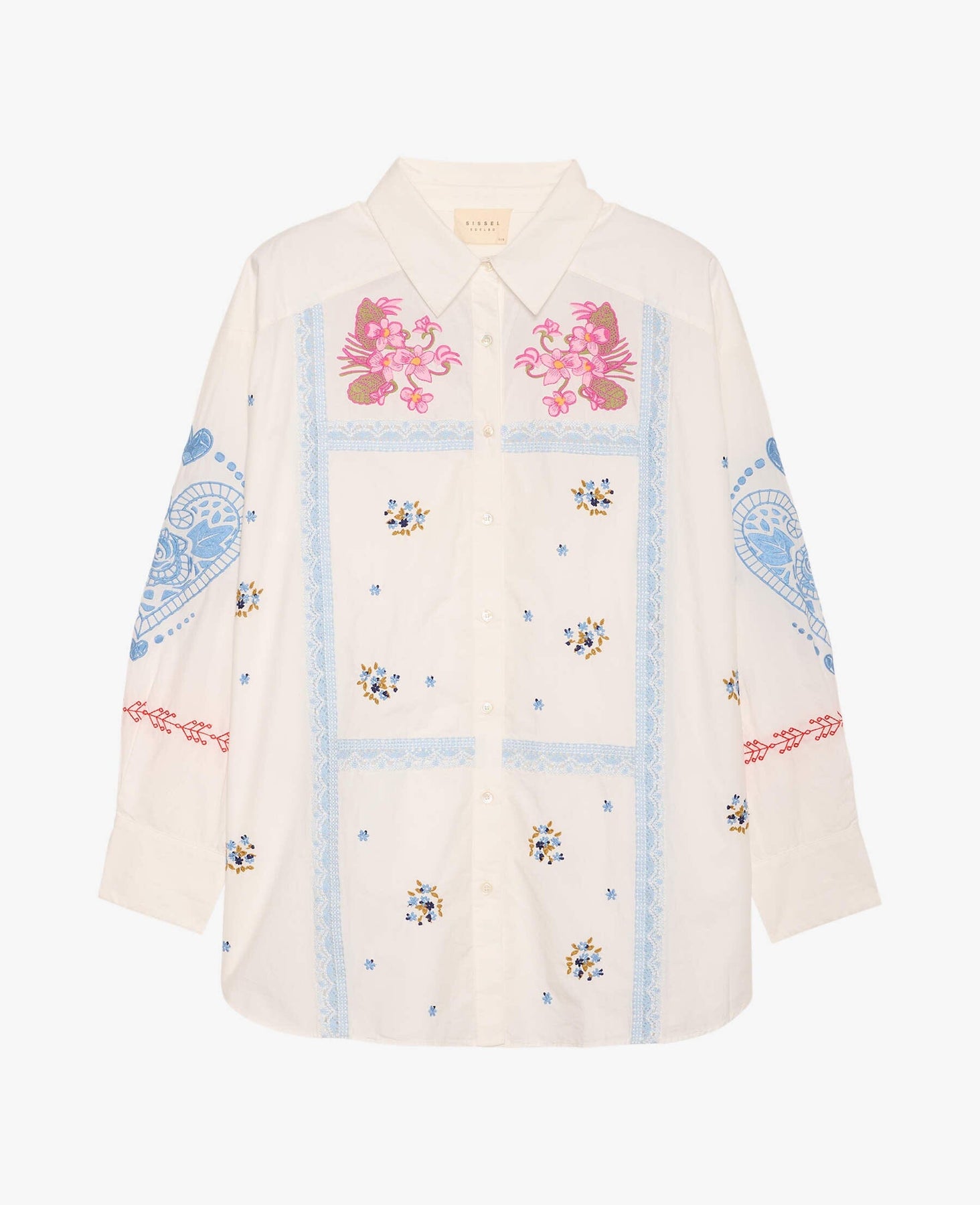 Wit overhemd van Sissel Edelbo met geborduurde bloemen en harten in roze en blauwe tinten en fijne kant langs de mouwen.