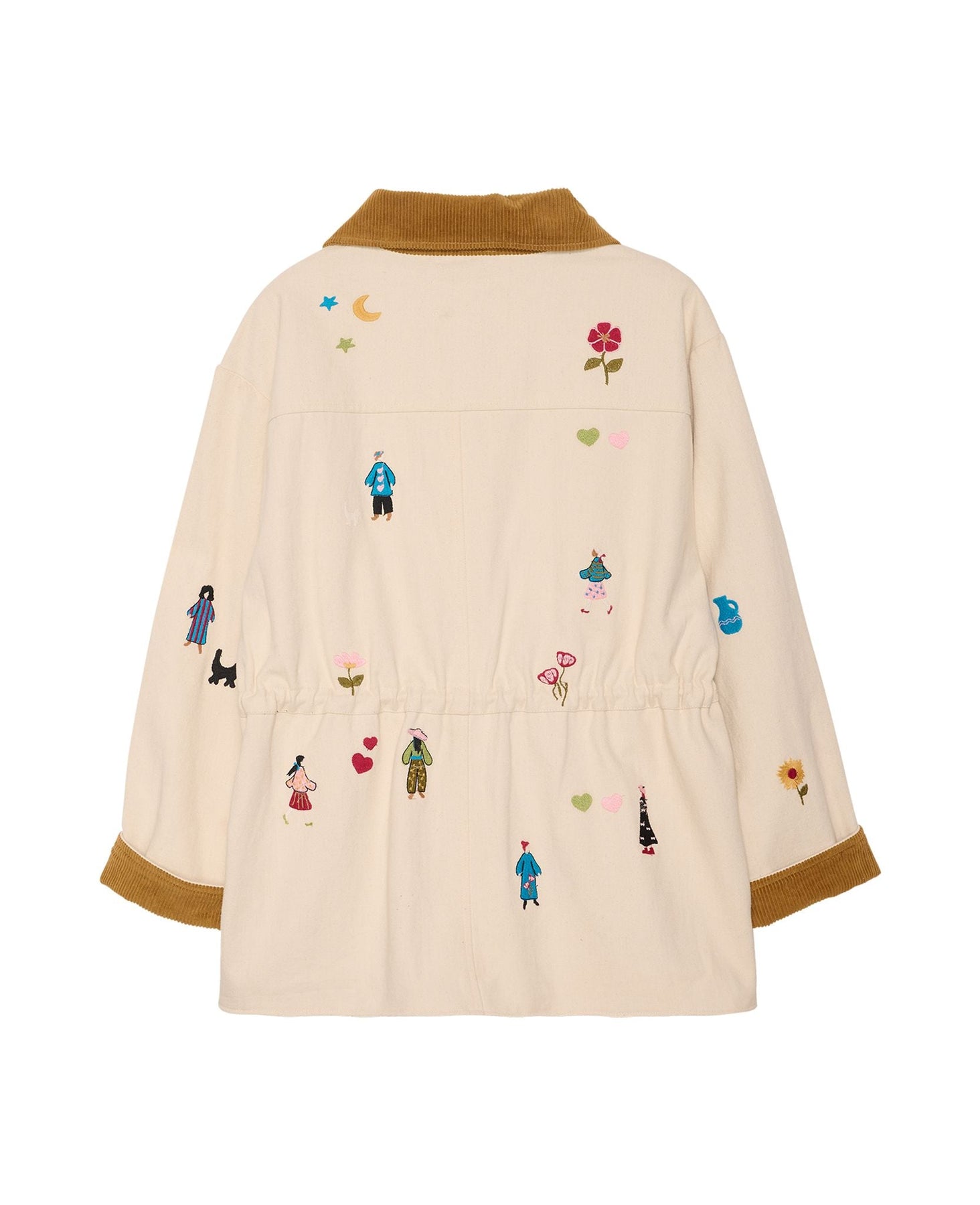 Witte jas van Sissel Edelbo met geborduurde motieven van figuren, bloemen en harten. De jas heeft een bruine kraag als contrast met de rest.