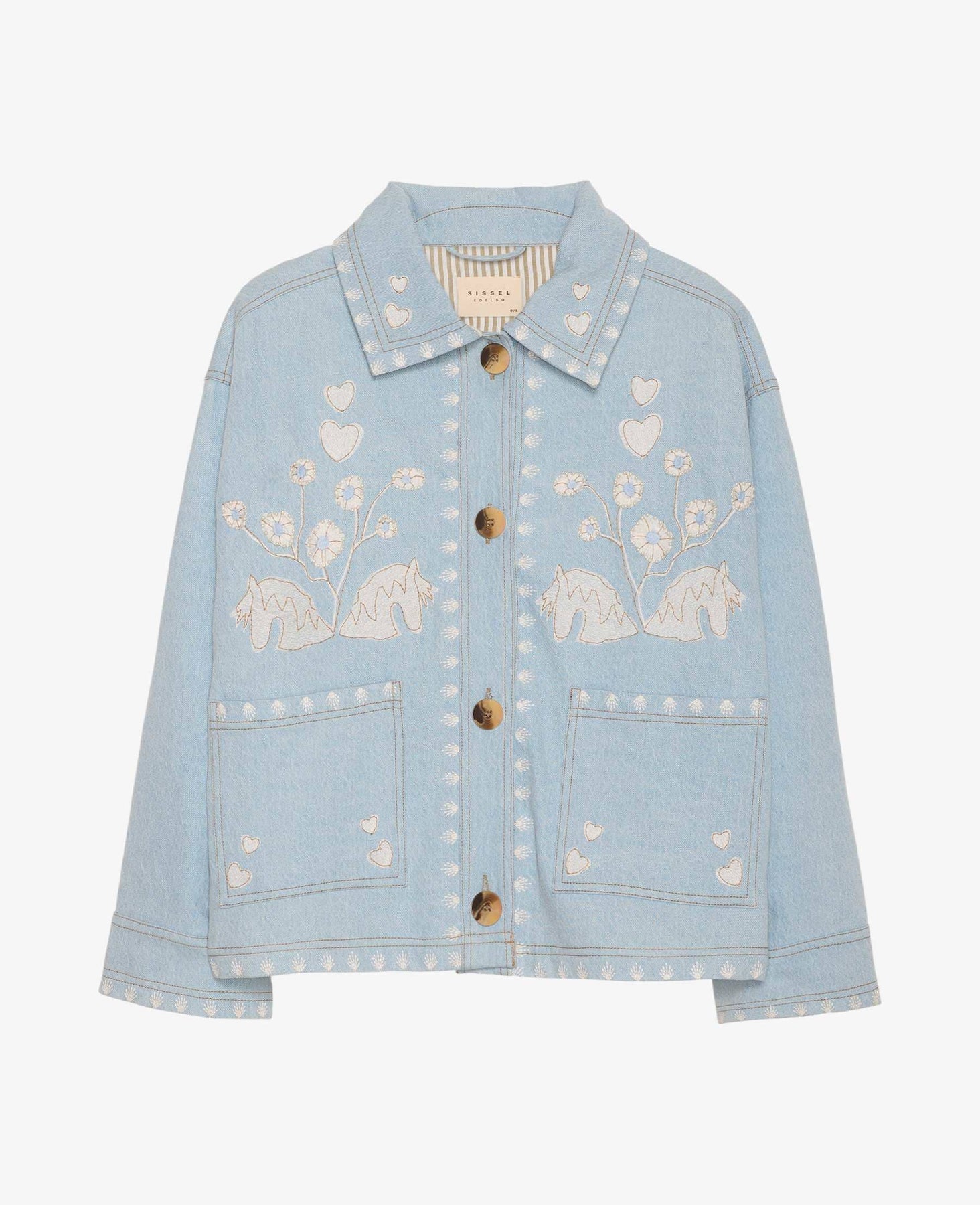 Denimjack van Sissel Edelbo, gemaakt van overtollige denim in een lichtblauwe tint. Het jack heeft een oversized pasvorm, gevormde mouwen en een grote kraag met knoopsluiting.