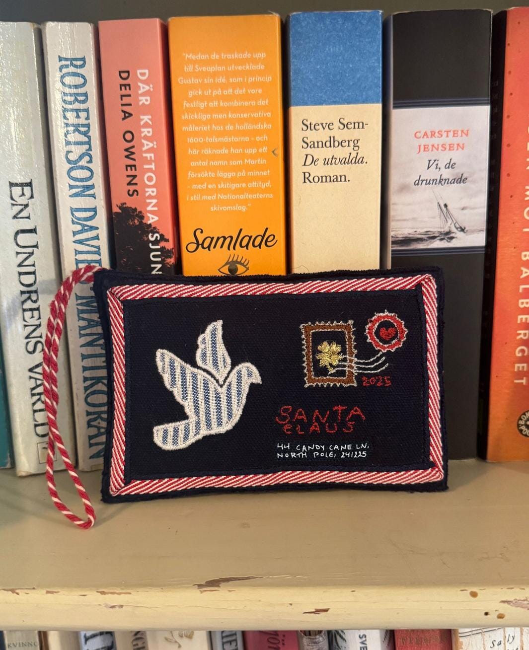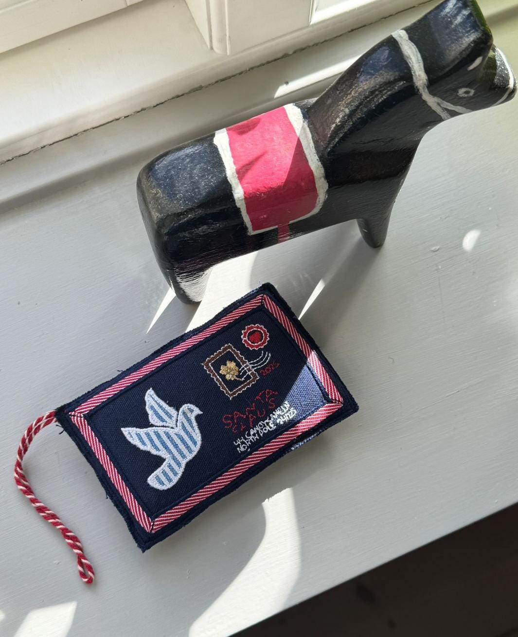 Kerstversiering van Sissel Edelbo in de vorm van een envelop van donkerblauwe katoen. Het ornament heeft een vredesduifapplicatie en geborduurde details met harten, rozen en postzegels.