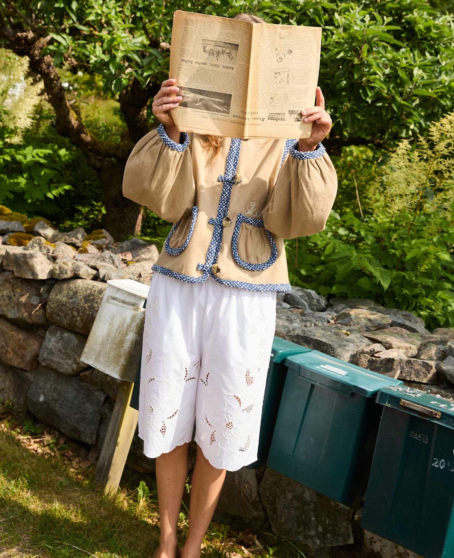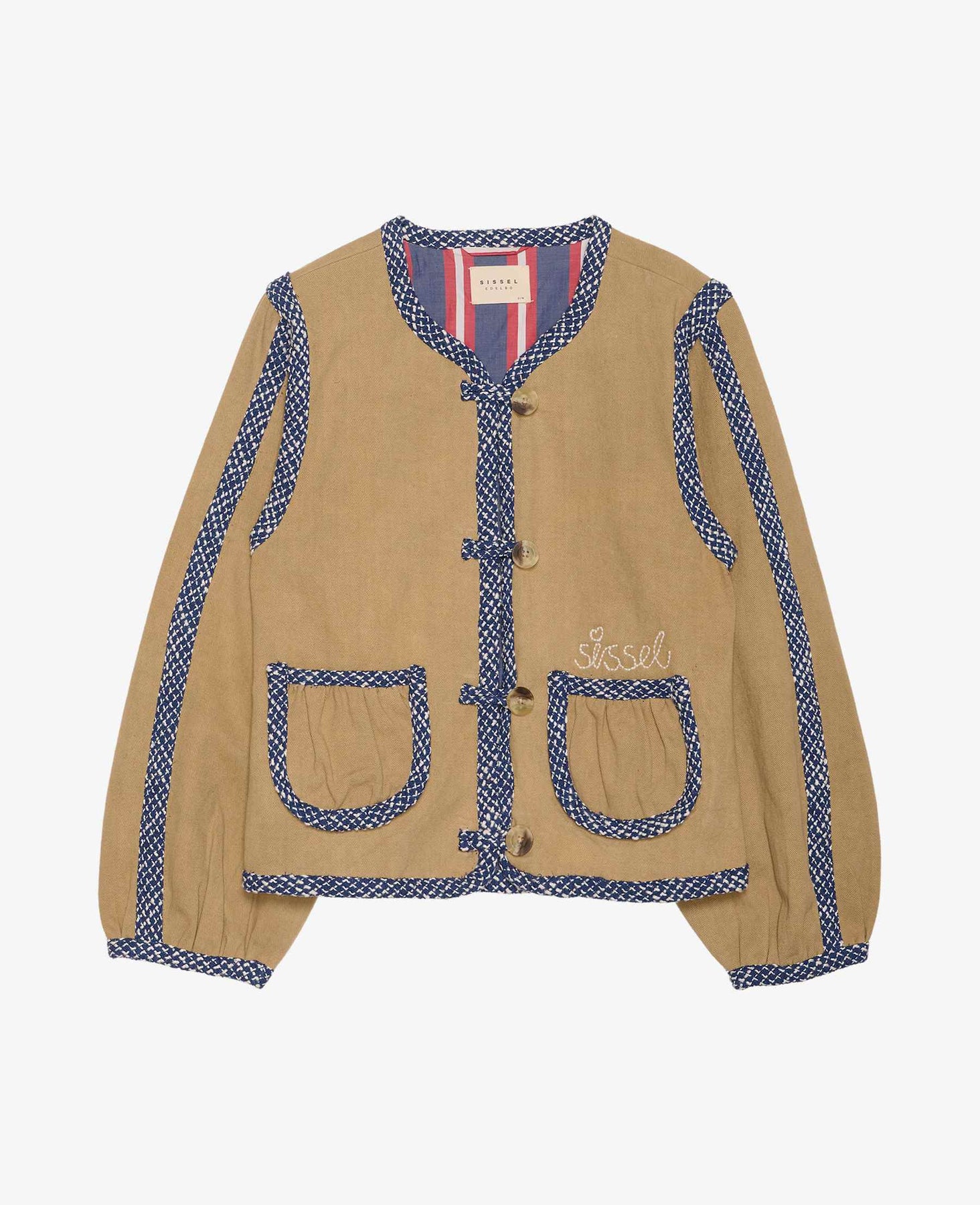 Jas van Sissel Edelbo in zandkleurige katoenen twill met blauwe, dessinrijke boucléranden langs de kraag, mouwen en zakken.