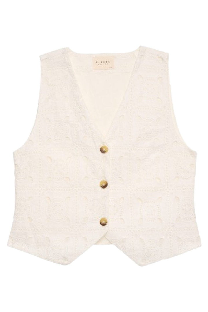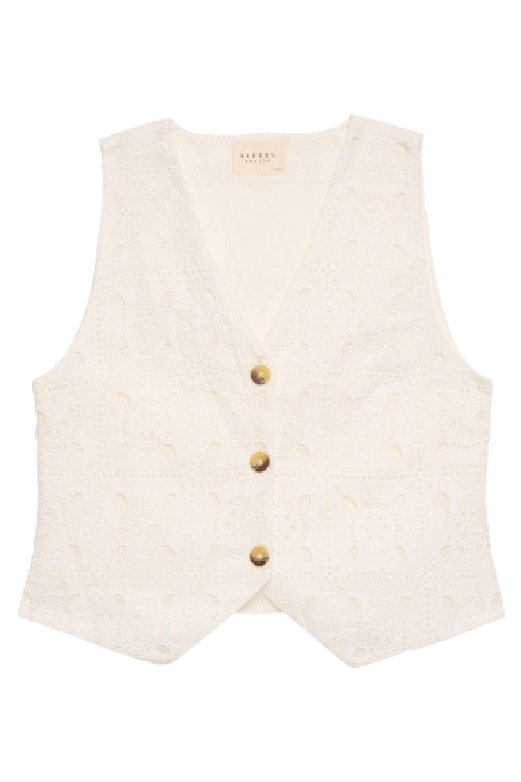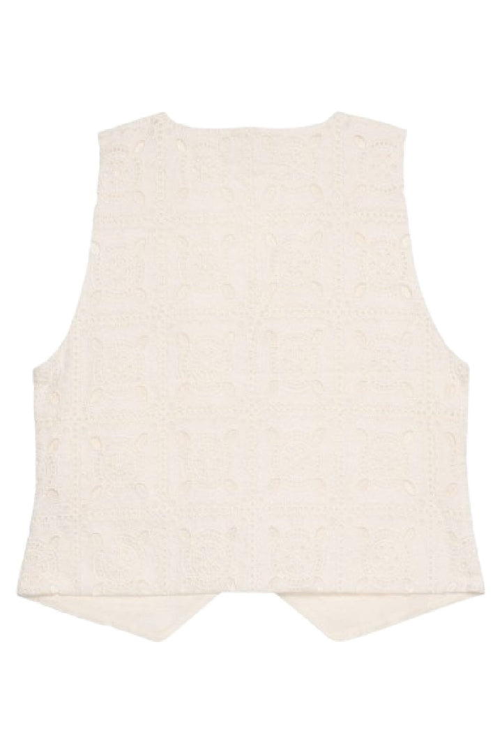 Korte vest van Sissel Edelbo in cream broderie anglaise katoen. De vest heeft een V-hals en bruine knopen in beenlook-finish.