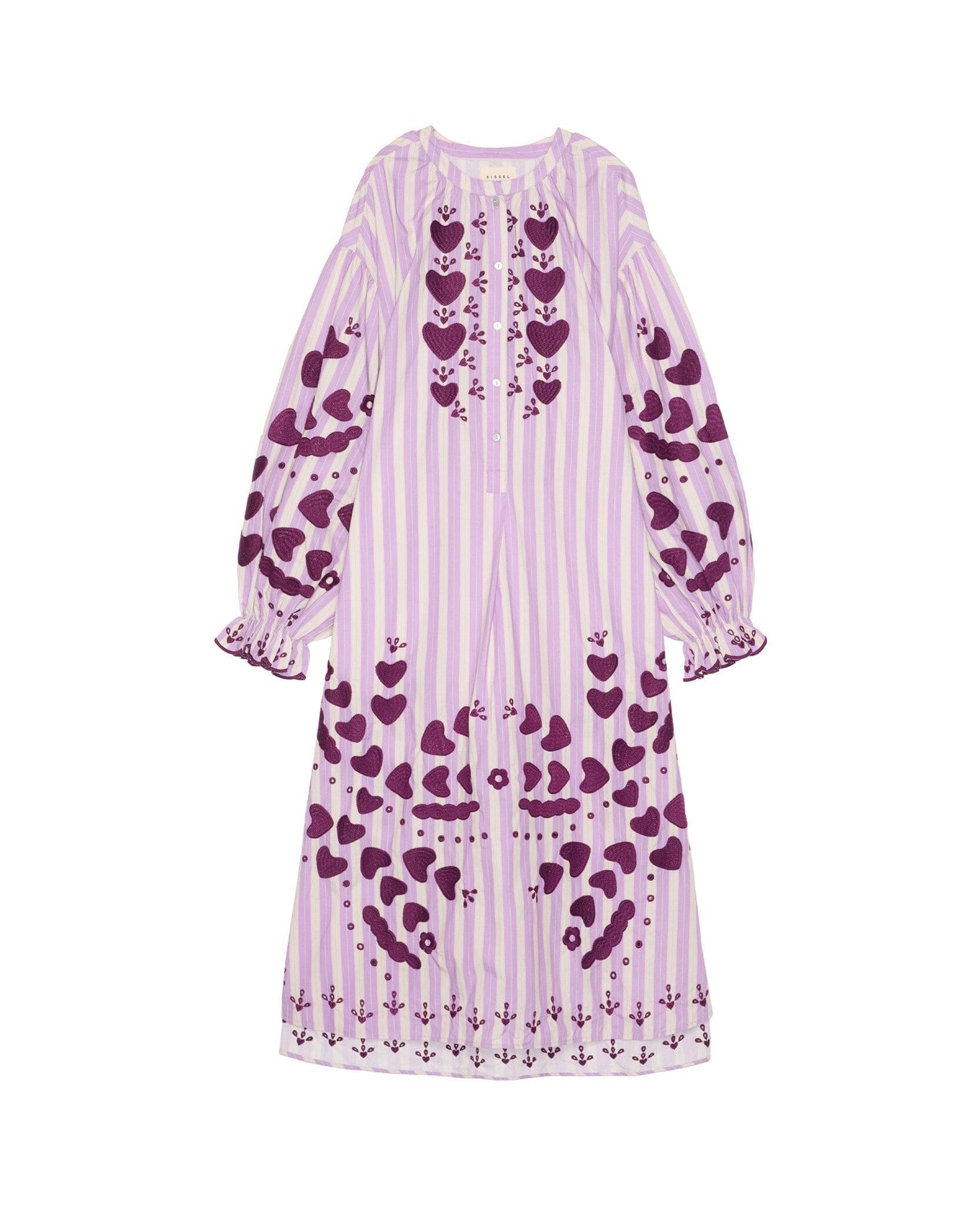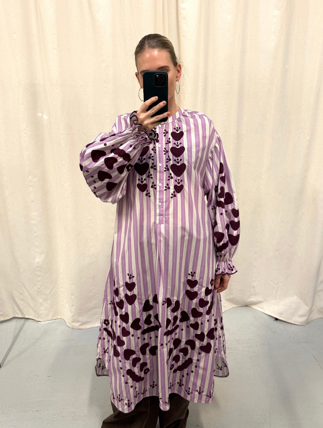 Gestreepte jurk van Sissel Edelbo in paars en wit met donkerpaarse hart- en bloemenborduursels. De jurk heeft garengeverfde strepen en is gemaakt van biologisch katoen.
