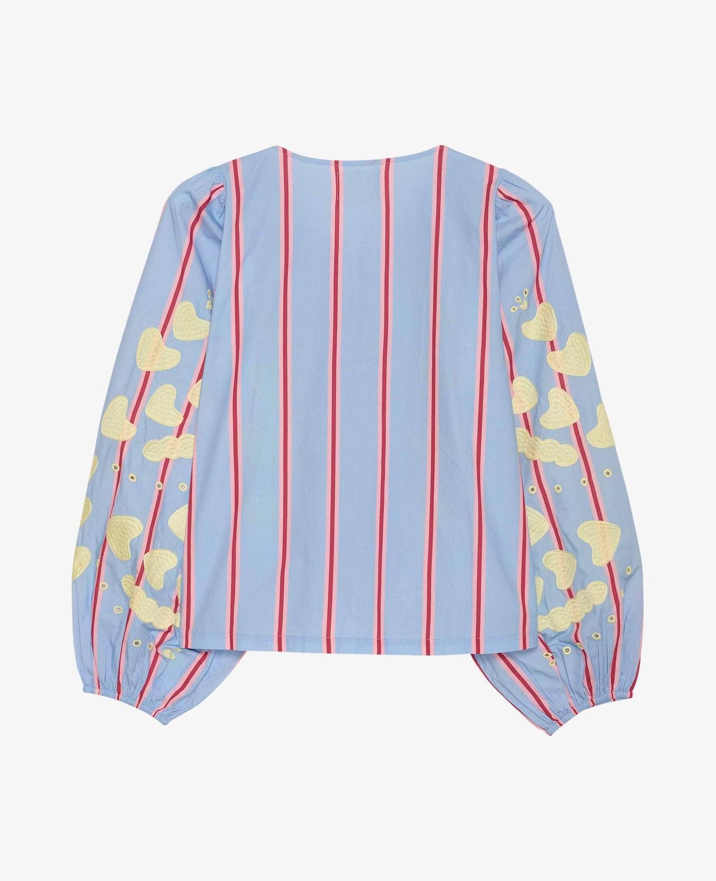 Lichtblau top van Sissel Edelbo met rode strepen en groene hartborduursels. De top is gemaakt van 100% biologische katoenpopeline met een open voorkant.