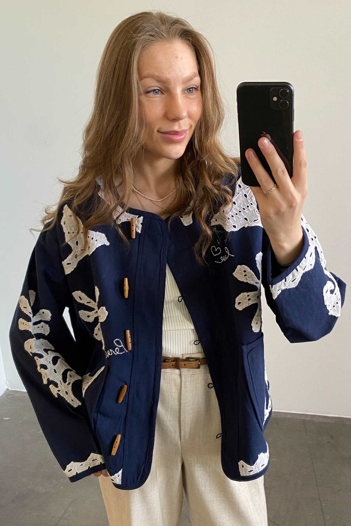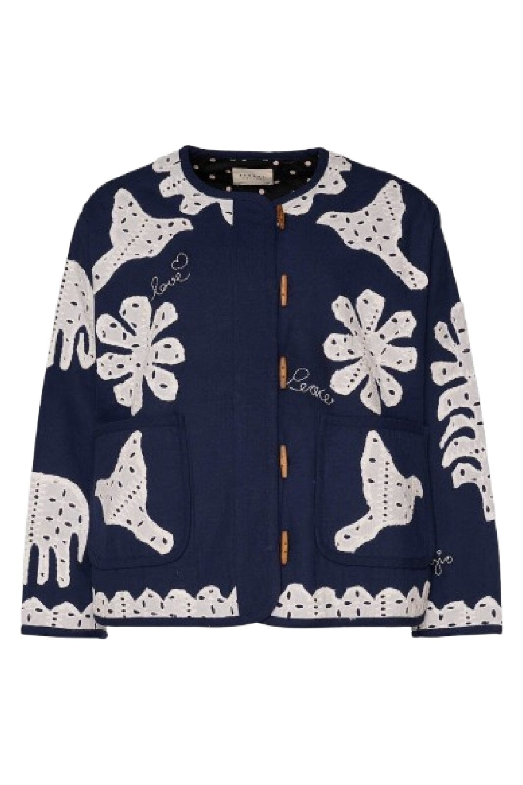 Jas fra Sissel Edelbo in donkerblau katoen met witte borduursels. De handgemaakte borduursels tonen vogels, olifanten en bloemen, en op de rug staat een vredesteken.