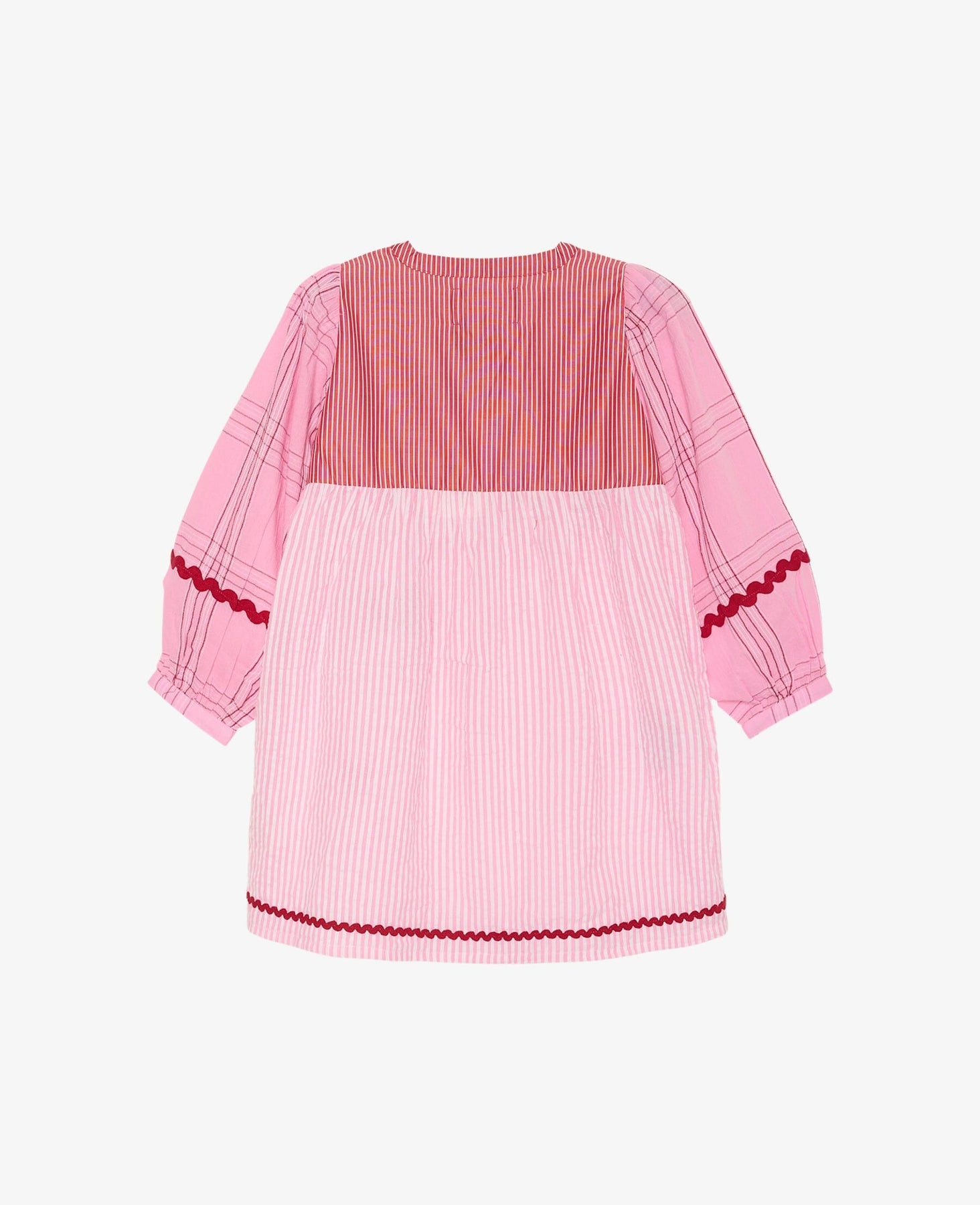 Mini-jurk van Sissel Edelbo in roze en rood met strepen. De jurk heeft handgemaakte details zoals ruches, strikken en borduurwerk, evenals lange ballonmouwen met zigzagband.