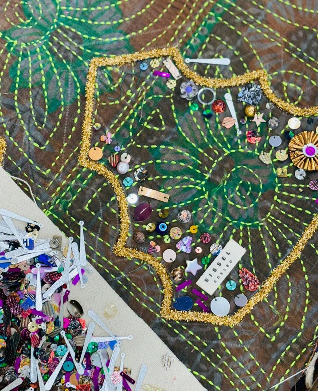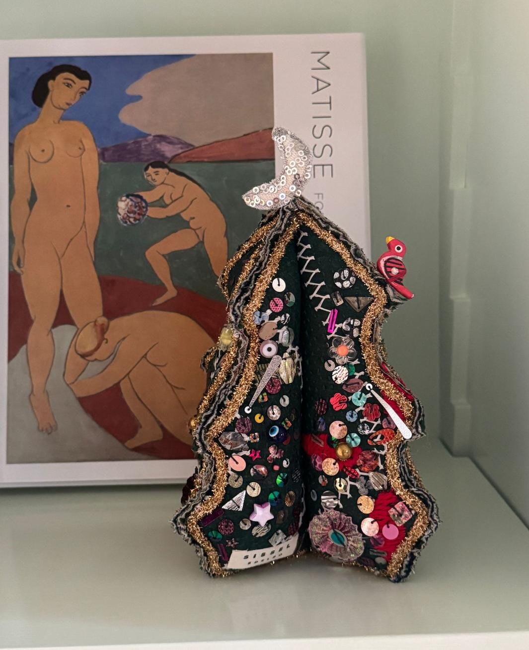 Decoratieve kerstboom van Sissel Edelbo, gemaakt van restanten van vintage kantha-dekens. De boom is groen met gouden en zilveren lurex langs de randen en versierd met Evil Eye-kralen en strikken.