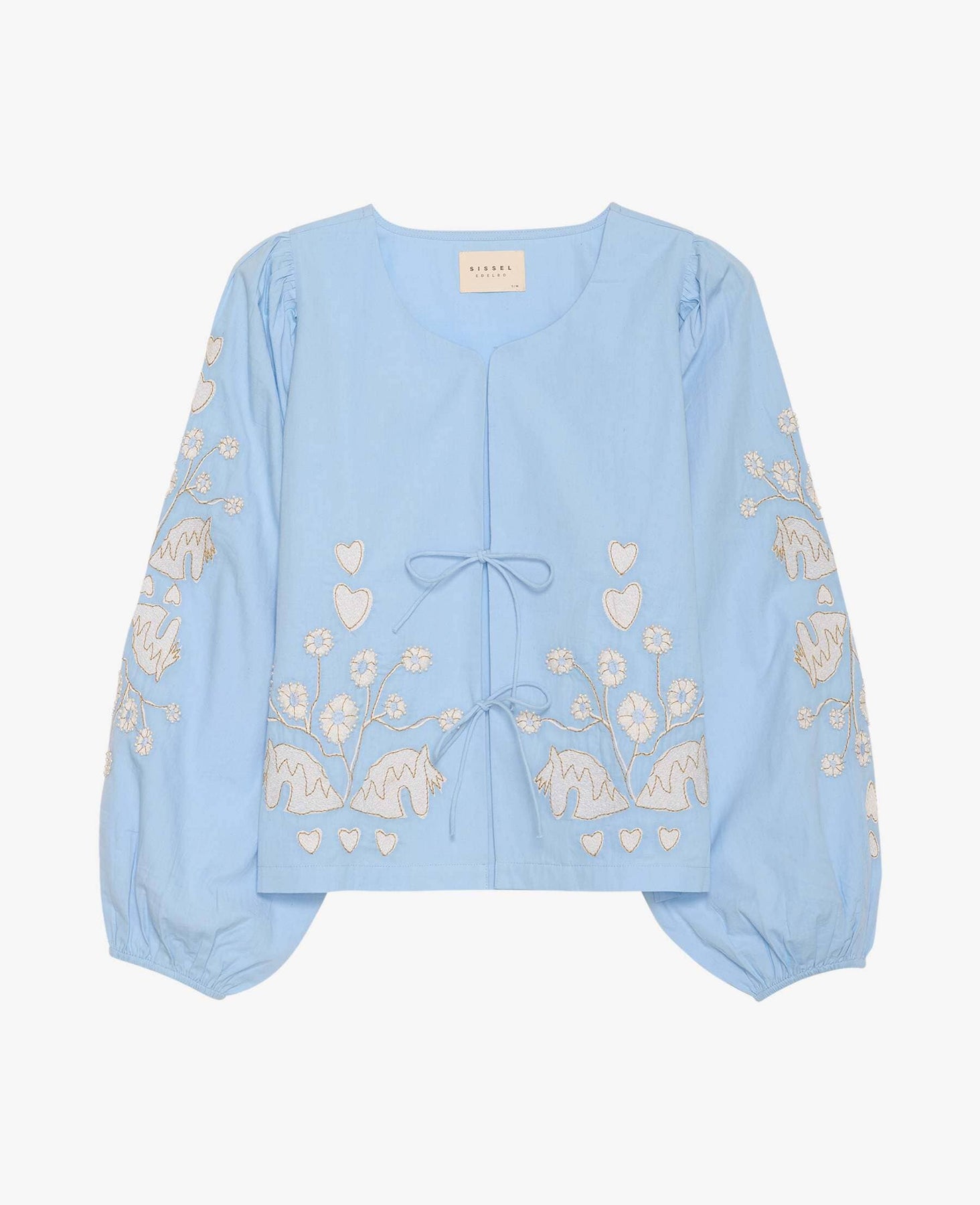 Lichtblau top van Sissel Edelbo met geborduurde harten en bloemen op de voorkant en de mouwen. De top heeft strikdetails aan de voorkant en parelversieringen.