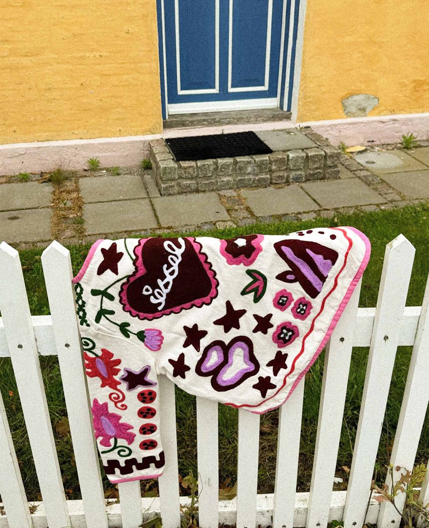 Korte jas van Sissel Edelbo in katoenlinnen met handgemaakt Suzani- borduurwerk. Het heeft twee voorzakken en is versierd met bloemen en patronen in tinten van roze, groen en bordeauxrood.