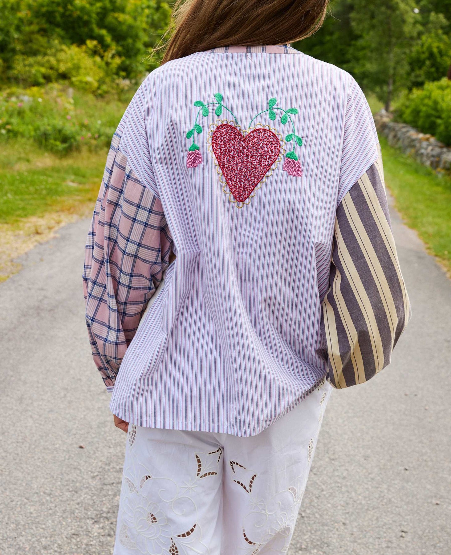Overhemd van Sissel Edelbo met een meerkleurig patchworkdesign in ruiten, strepen en bloemenprint. Het overhemd heeft parelmoeren knopen en een geborduurd hart op de rug.