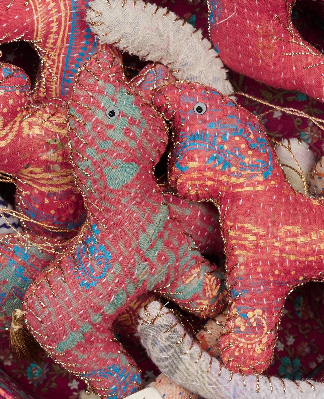 Schommelpaard-ornament van Sissel Edelbo, gemaakt van resten van kantha-dekens met goudkleurige lurex-stiksel. Het ornament heeft een rode lichaam met blauwe patronen.