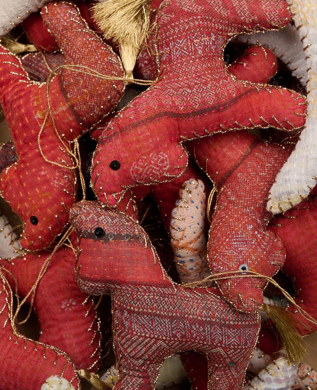 Schommelpaard ornament van Sissel Edelbo, gemaakt van resten van kantha-dekens. Elk schommelpaard is handgemaakt met de kantha-borduurtechniek, die oude katoenen saris hergebruikt.