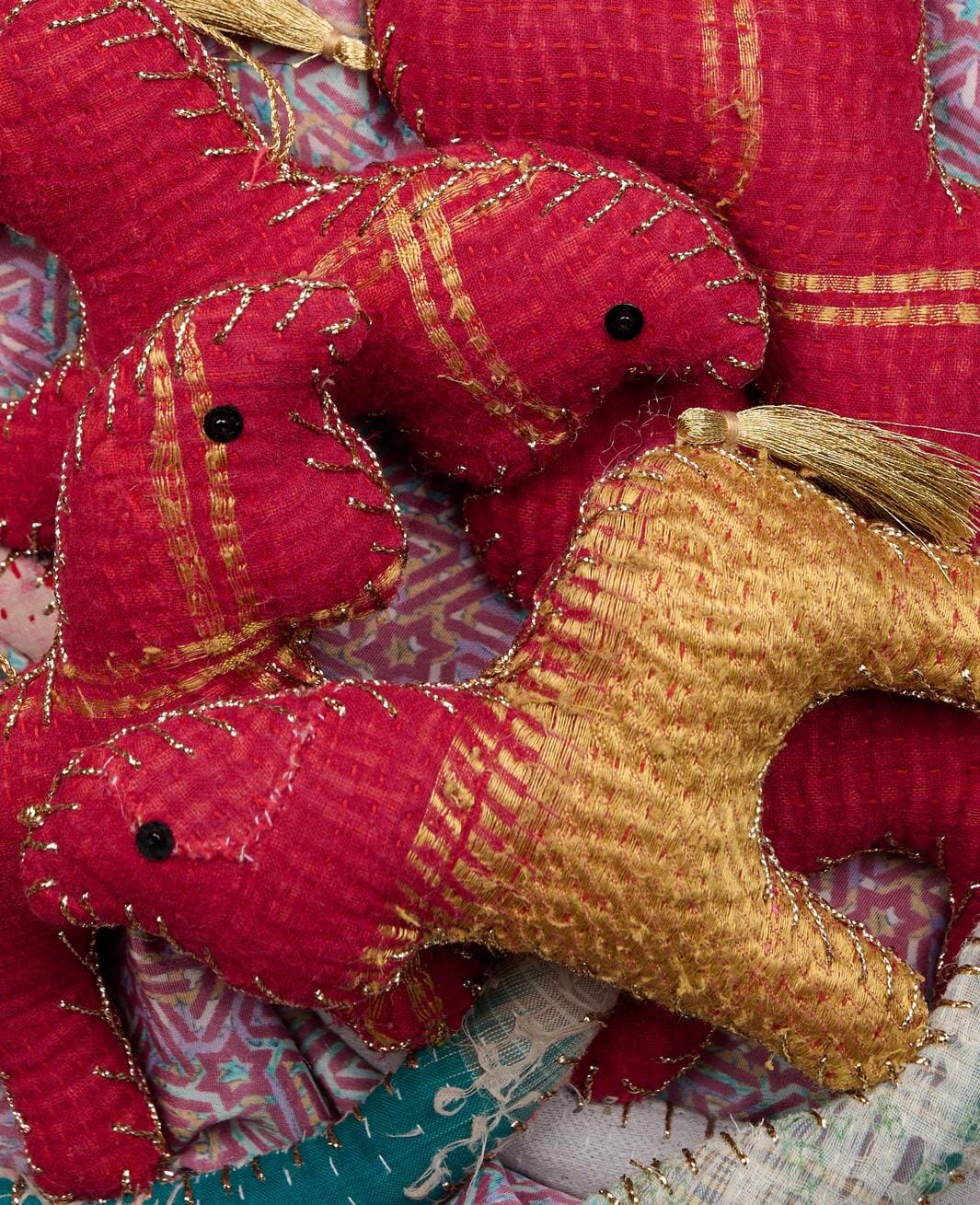 Schommelpaard-ornament van Sissel Edelbo, gemaakt van restjes van kantha-dekens. Het ornament is vervaardigd uit upcycled katoenen saris uit India met de kantha borduurtechniek.