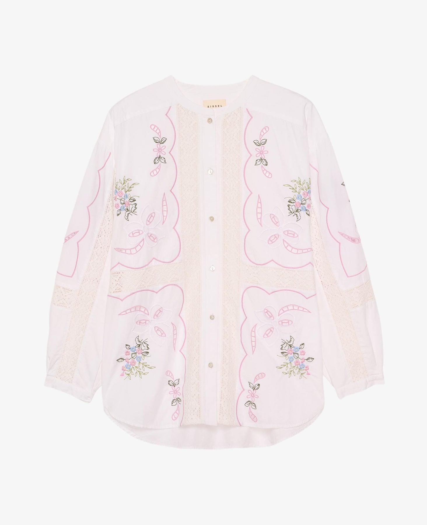 Witte blouse van Sissel Edelbo met geborduurde bloemmotieven in pasteltinten en kantdetails. De blouse heeft een losse pasvorm en is gemaakt van biologisch katoen.