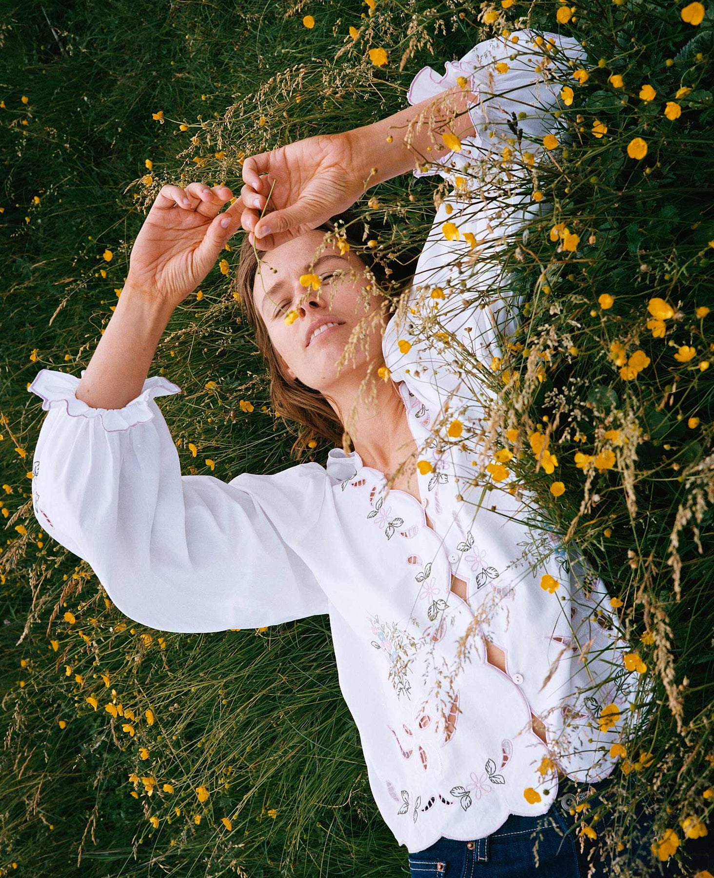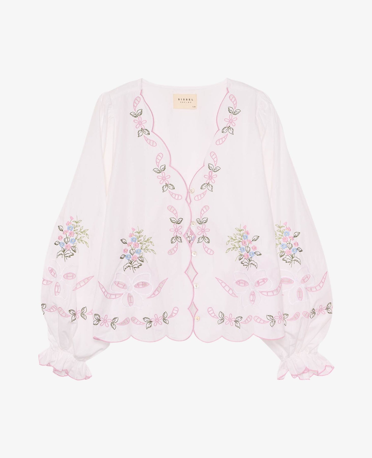 Witte top van Sissel Edelbo met pastelkleurig bloemenborduursel op de voorkant en de mouwen. De top heeft een losse pasvorm en lange mouwen.