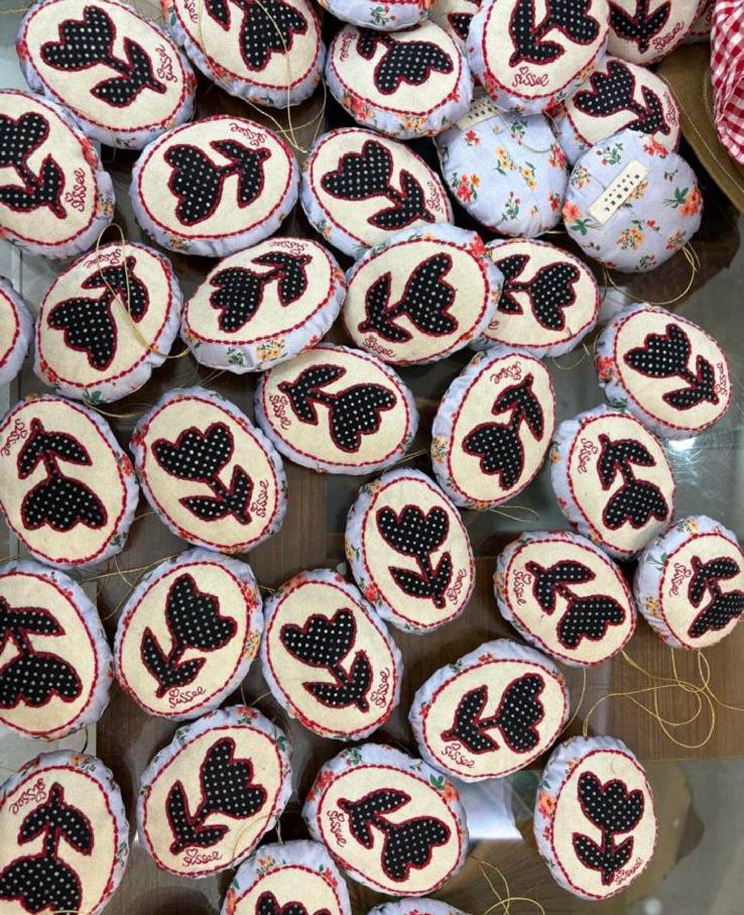 Een paasei-ornament van Sissel Edelbo met een geborduurd bloemenpatroon in paarse tinten. De achterkant heeft een kleurrijk bloemenpatroon op een lichte achtergrond.