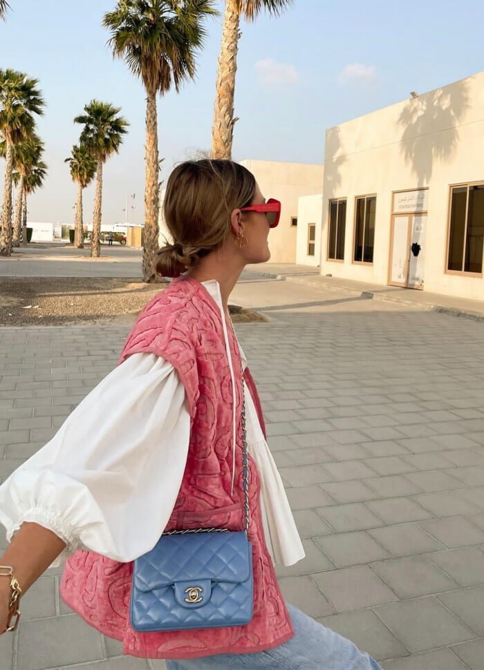 Roze velourvest van Sissel Edelbo met handgemaakt patchwork. De vest heeft een oversized ontwerp met verlaagde schouders en praktische vetersluiting aan de voorkant.