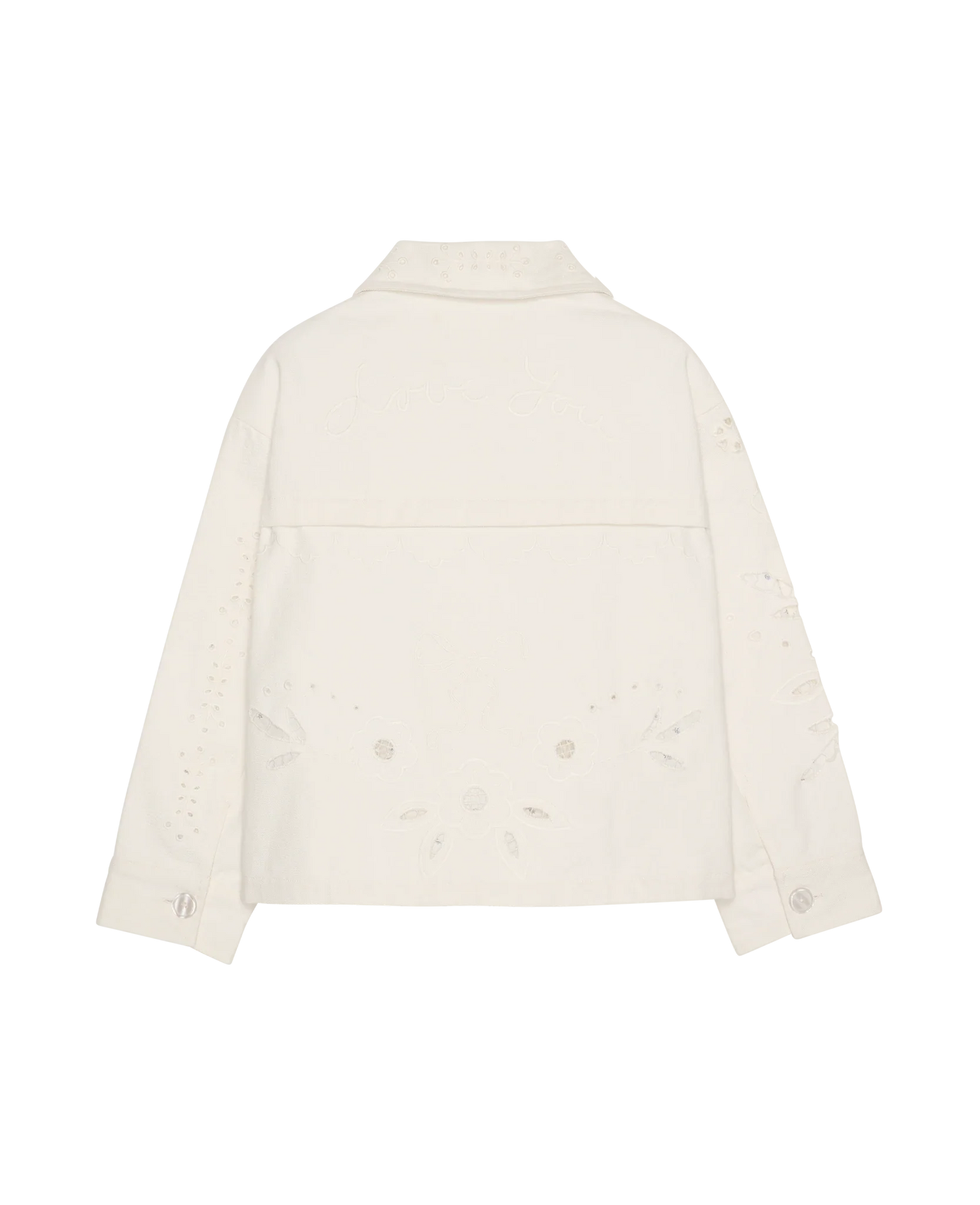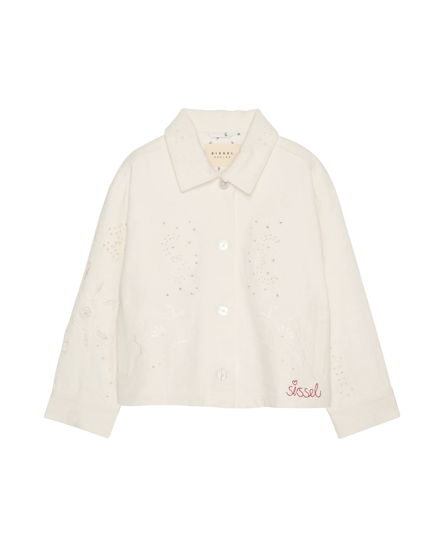 Witte jas van Sissel Edelbo, gemaakt van biologisch katoen-twill. De jas heeft geborduurde bloemdetails op de voorkant en de kraag, evenals grote parelmoerknopen.