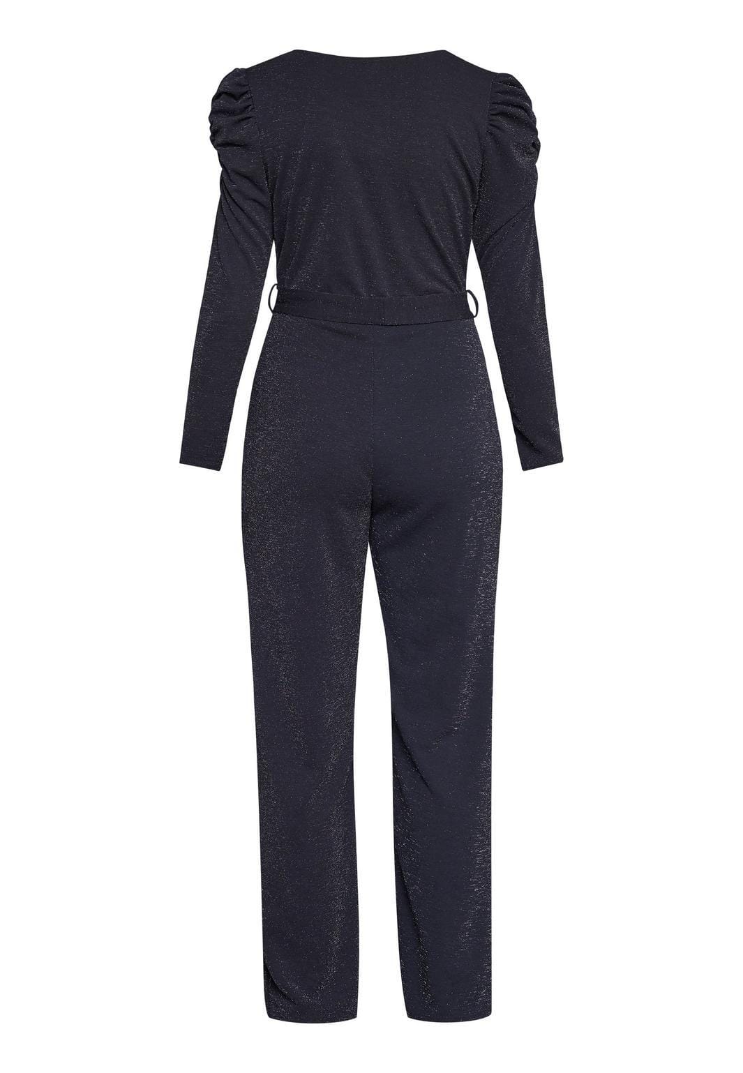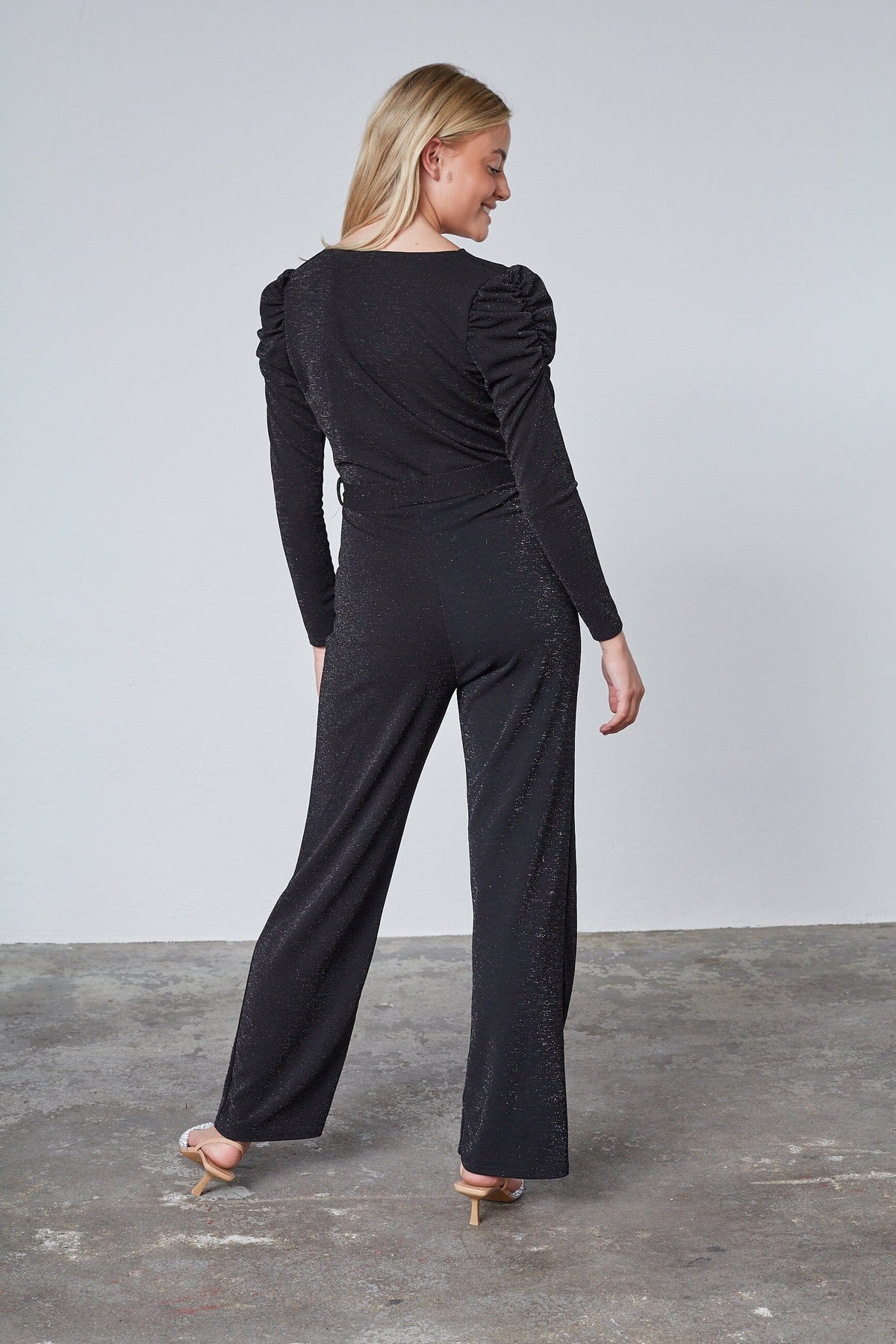 Zwarte jumpsuit van Sisters Point met zilverglitter-effect. Het heeft een V-hals, pofmouwen met gerimpelde details bij de schouders en een strikband in de taille.