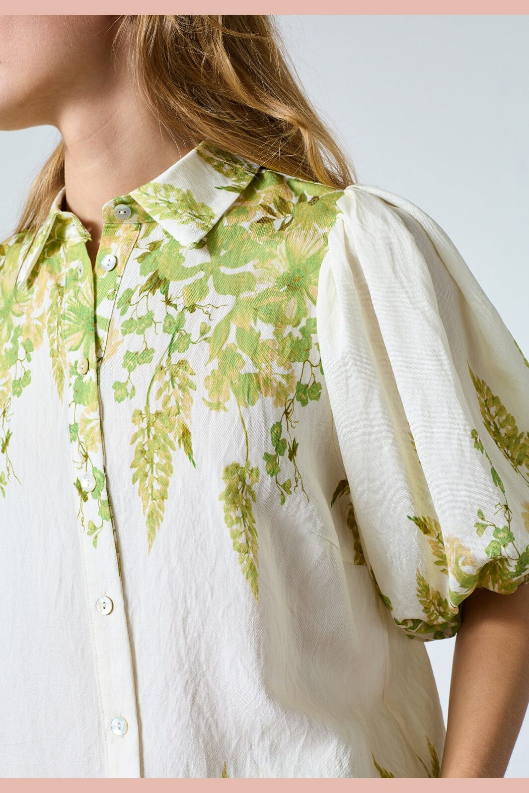 Blouse van Sisters Point met bloemenprint in groene en gele tinten op een crèmekleurige ondergrond. De blouse heeft korte pofmouwen met elastische boorden.