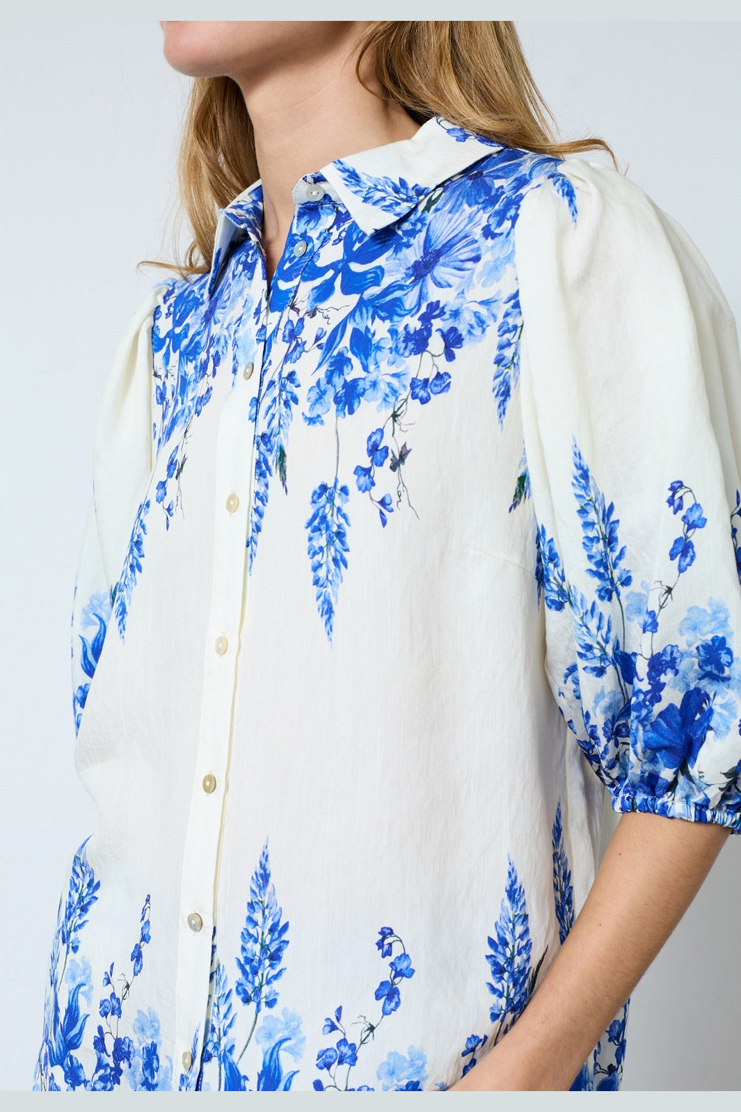 Blouse van Sisters Point met een bloemenpatroon in blauwe tinten op een witte achtergrond. De blouse heeft korte pofmouwen en een klassieke overhemdkraag.