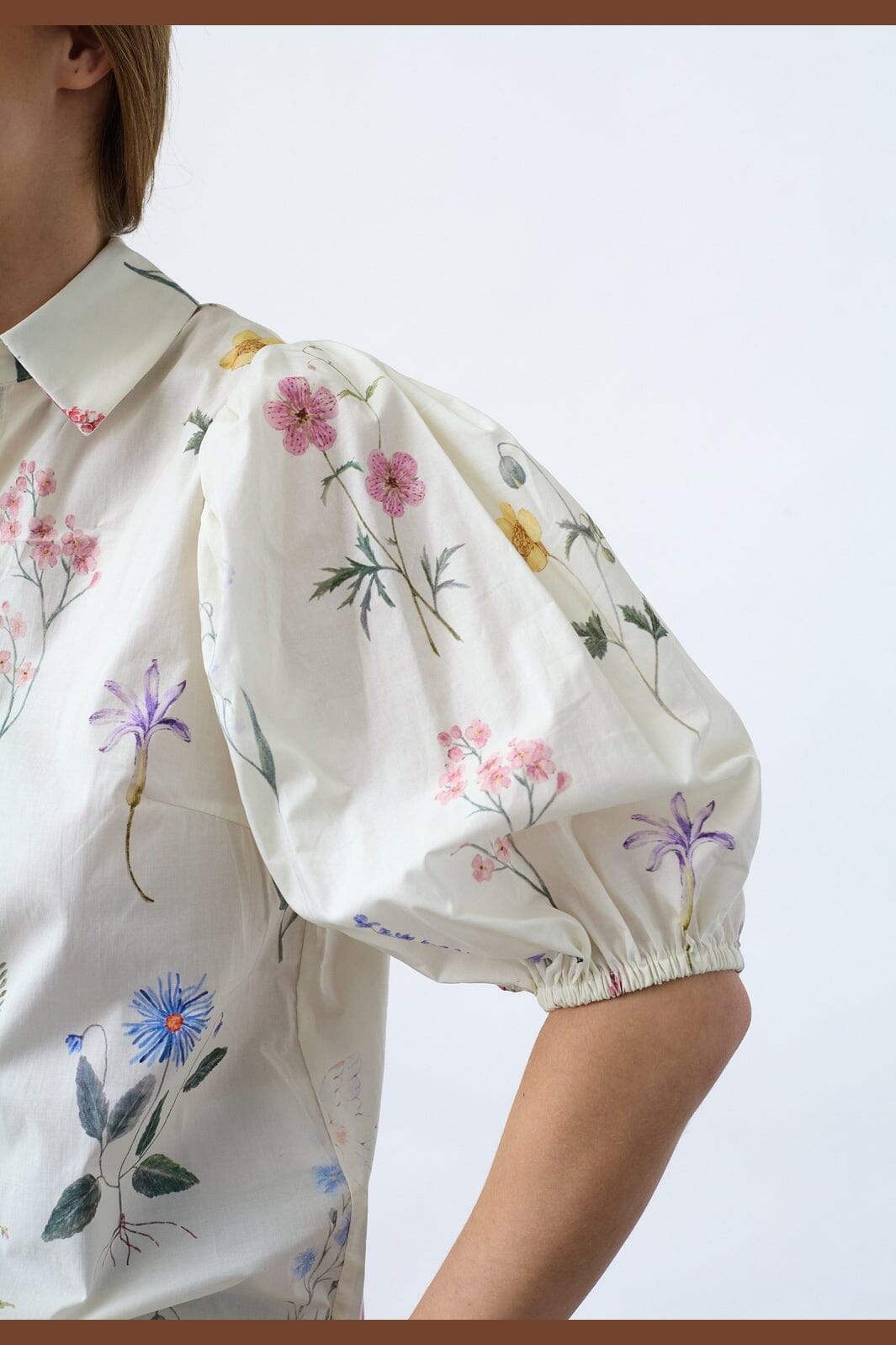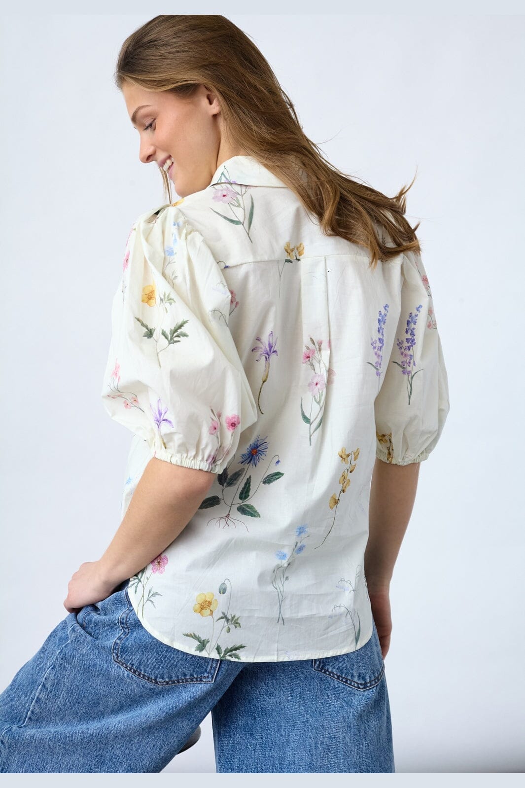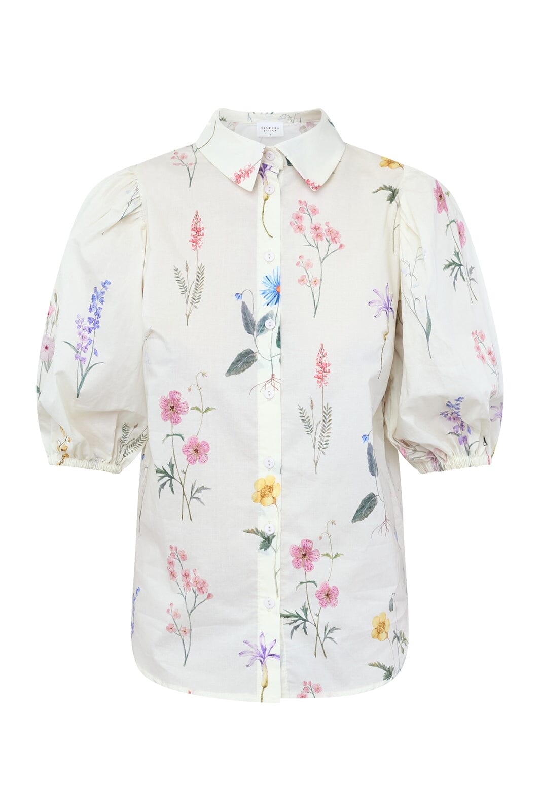 Blouse van Sisters Point in een lichte crèmekleur met een meerkleurig bloemenpatroon. De blouse heeft korte pofmouwen en een klassieke overhemdkraag met knoopsluiting.