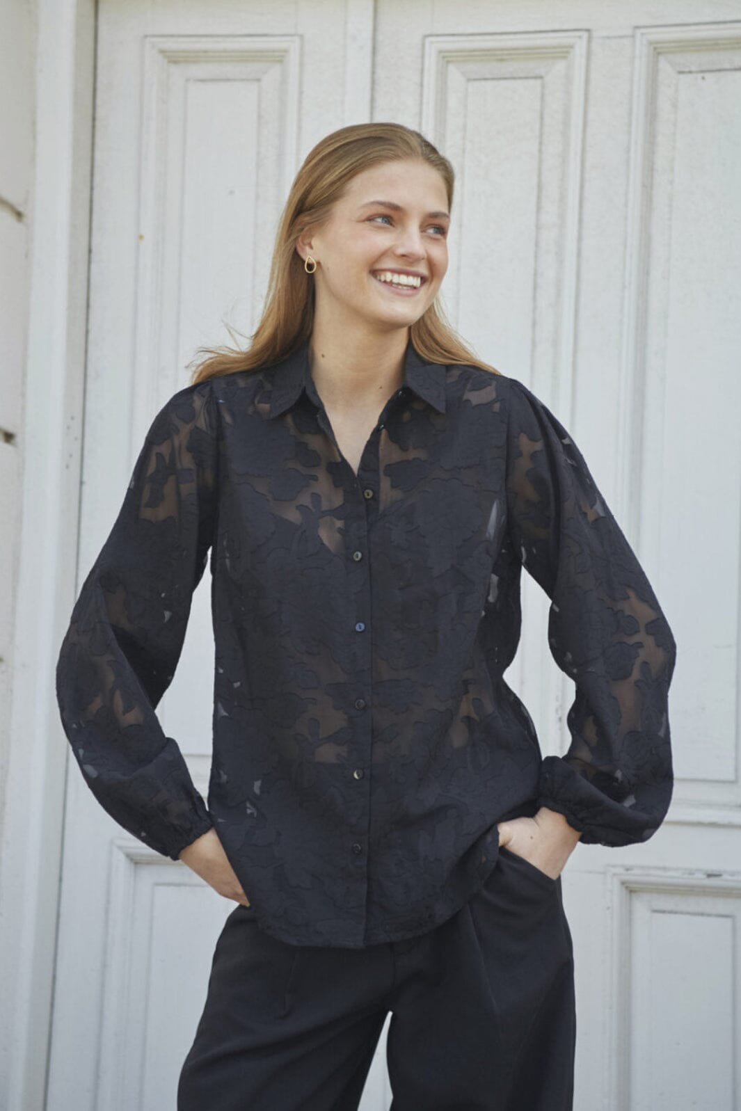Zwarte blouse van Sisters Point met transparant bloemenpatroon in kant. De blouse heeft een losse pasvorm met klassieke kraag en knoopsluiting aan de voorkant. De lange mouwen worden afgesloten met manchetten.