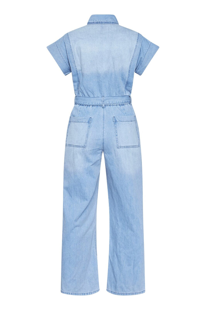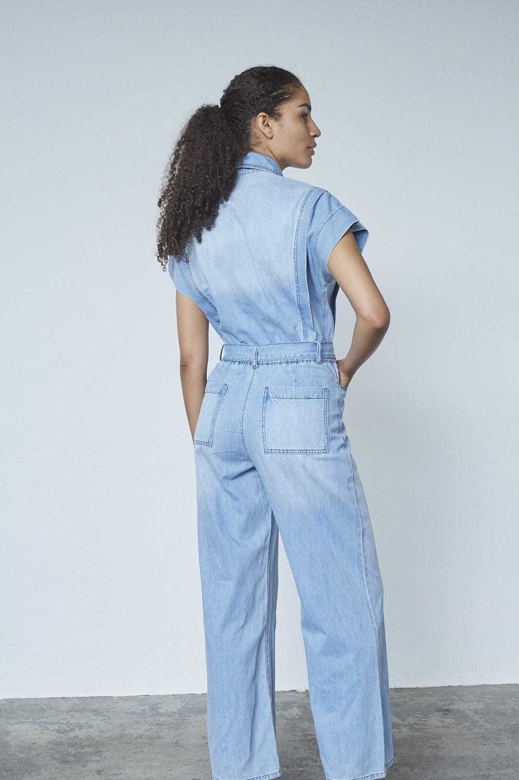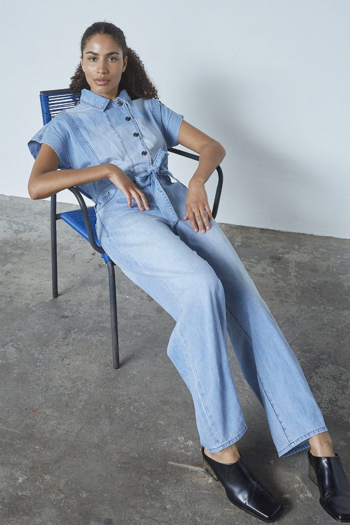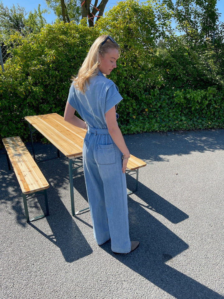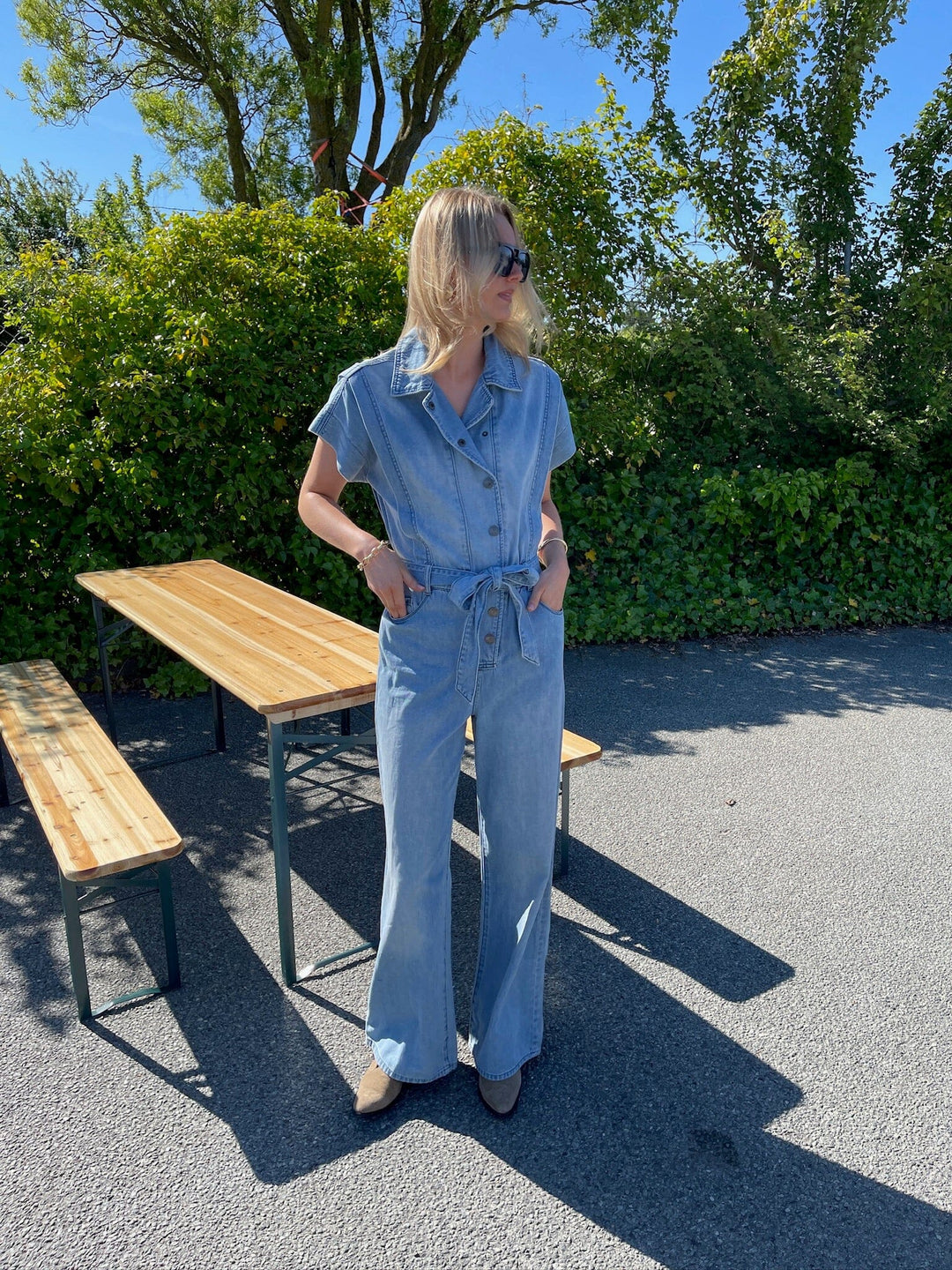 Lichtblau denim jumpsuit van Sisters Point met overhemdkraag en korte mouwen. De jumpsuit heeft een losse pasvorm en komt tot aan de enkels.
