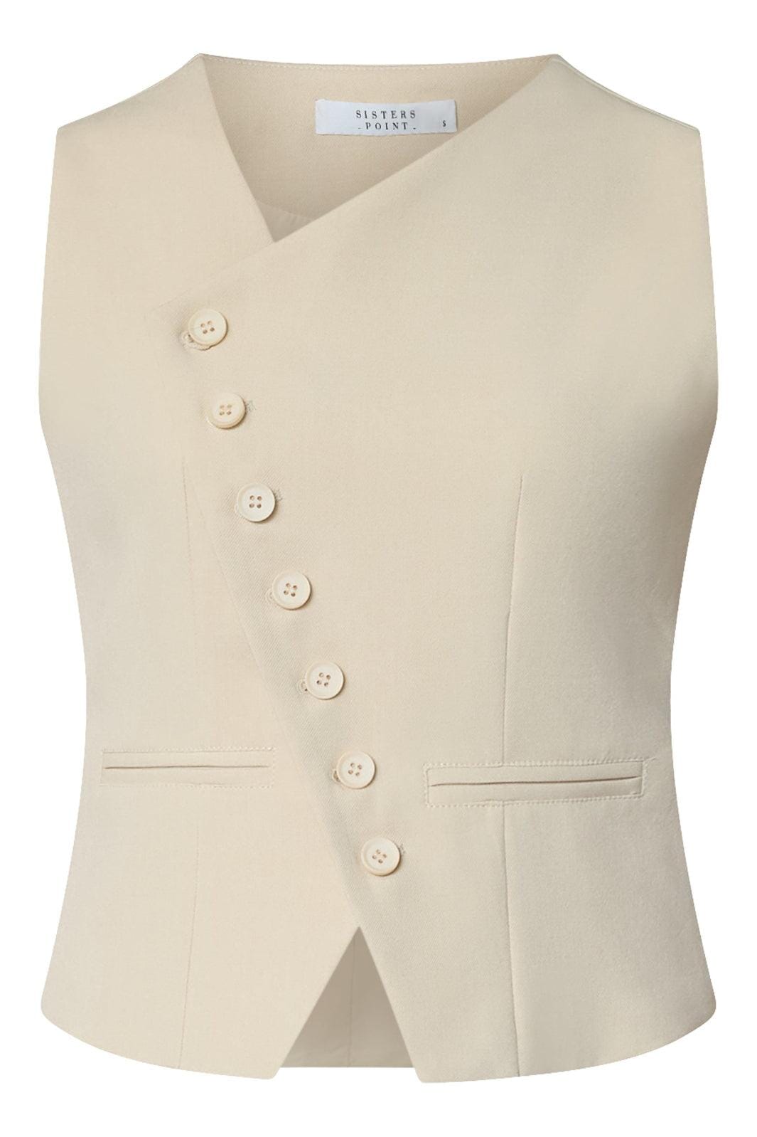 Mouwloos gilet van Sisters Point in een lichtbeige tint. Het gilet heeft een V-hals en decoratieve knopen langs de voorkant.