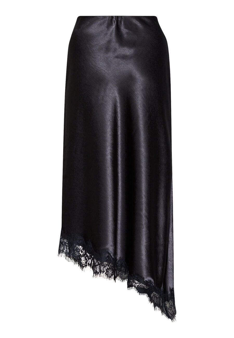 Zwarte rok van Sisters Point met een glanzende satijnlook in geweven polyester. De rok heeft een asymmetrische snit met een schuine zoom afgewerkt met kant.