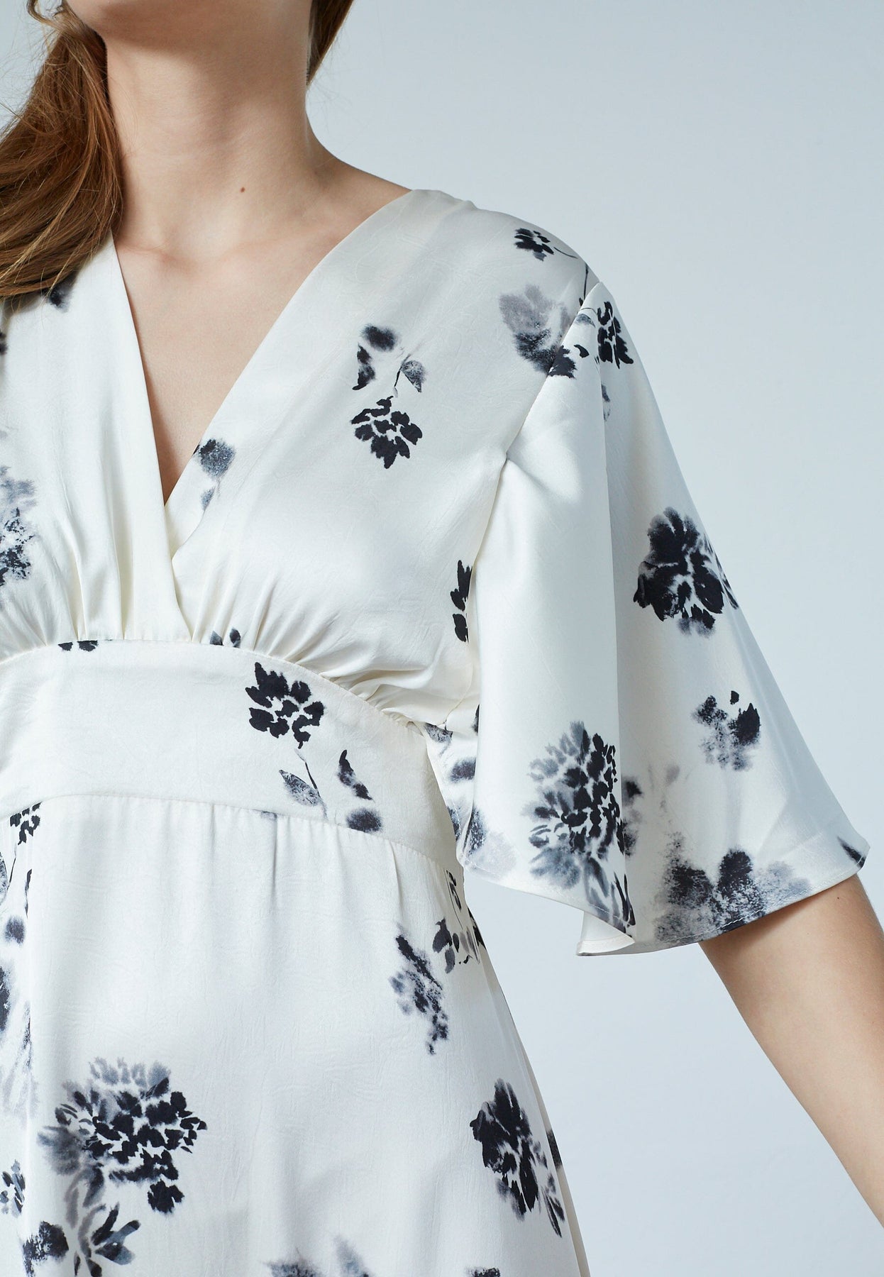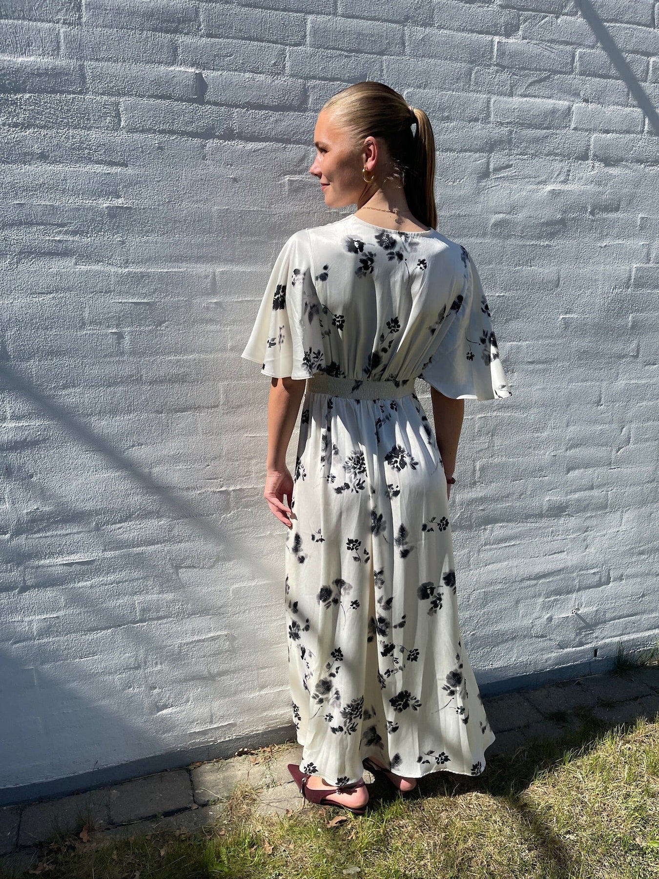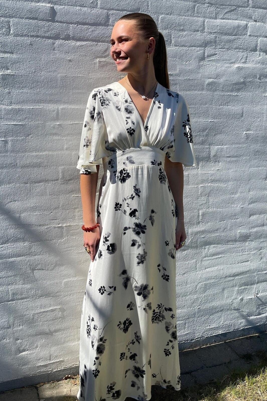Enkel-lange jurk van Sisters Point in crème met zwarte bloemen. De jurk heeft een V-hals en korte fladdermouwen. De smock taille zorgt voor een goede pasvorm.