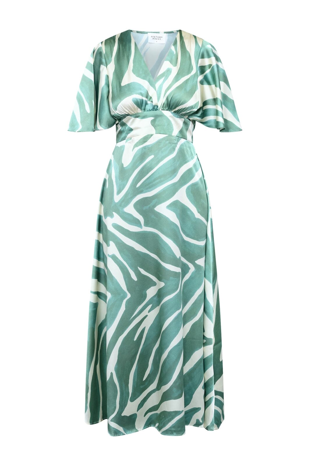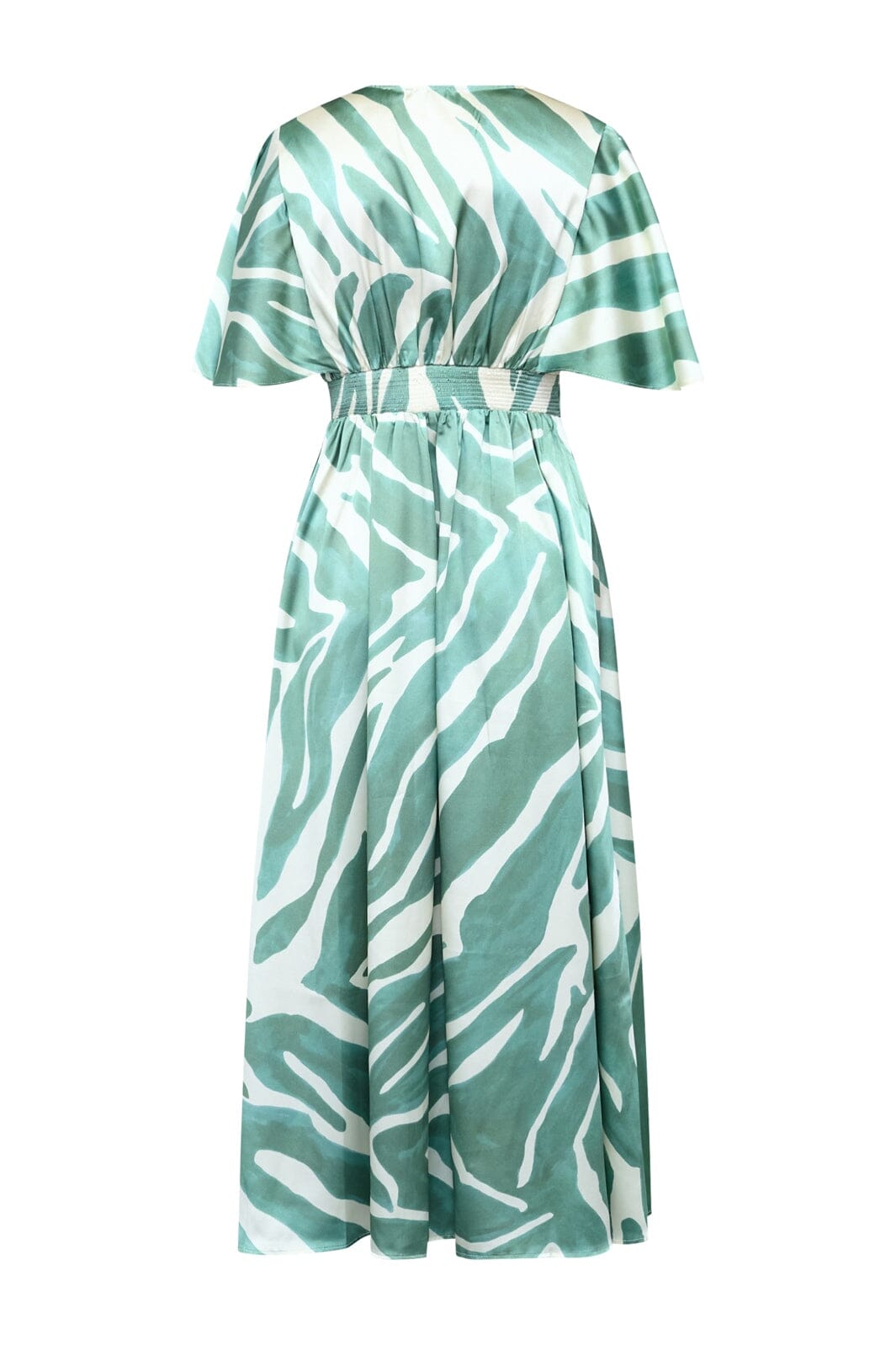 Jurk van Sisters Point met een groen en wit grafisch patroon. De jurk heeft een enkellange lengte, korte mouwen en een V-hals.