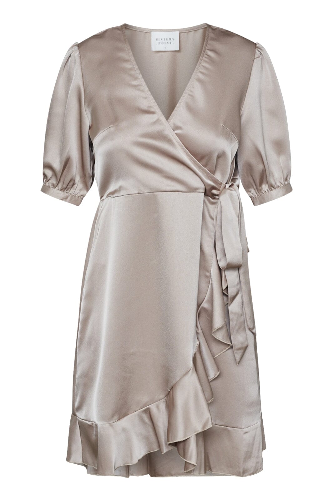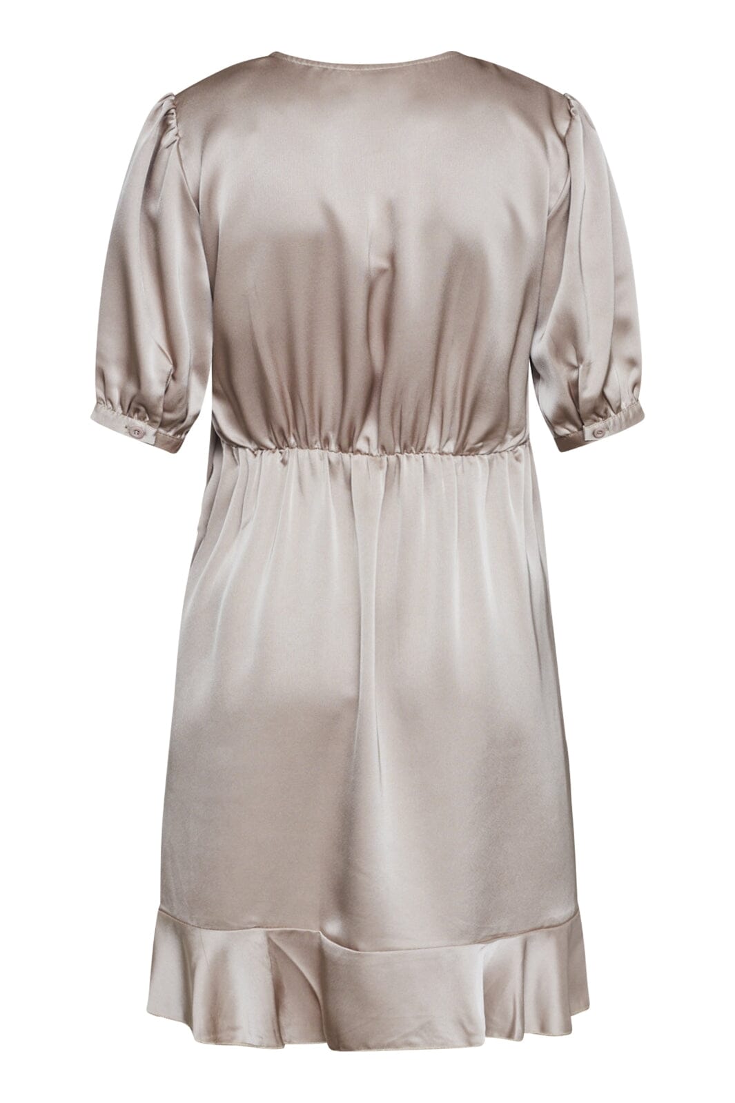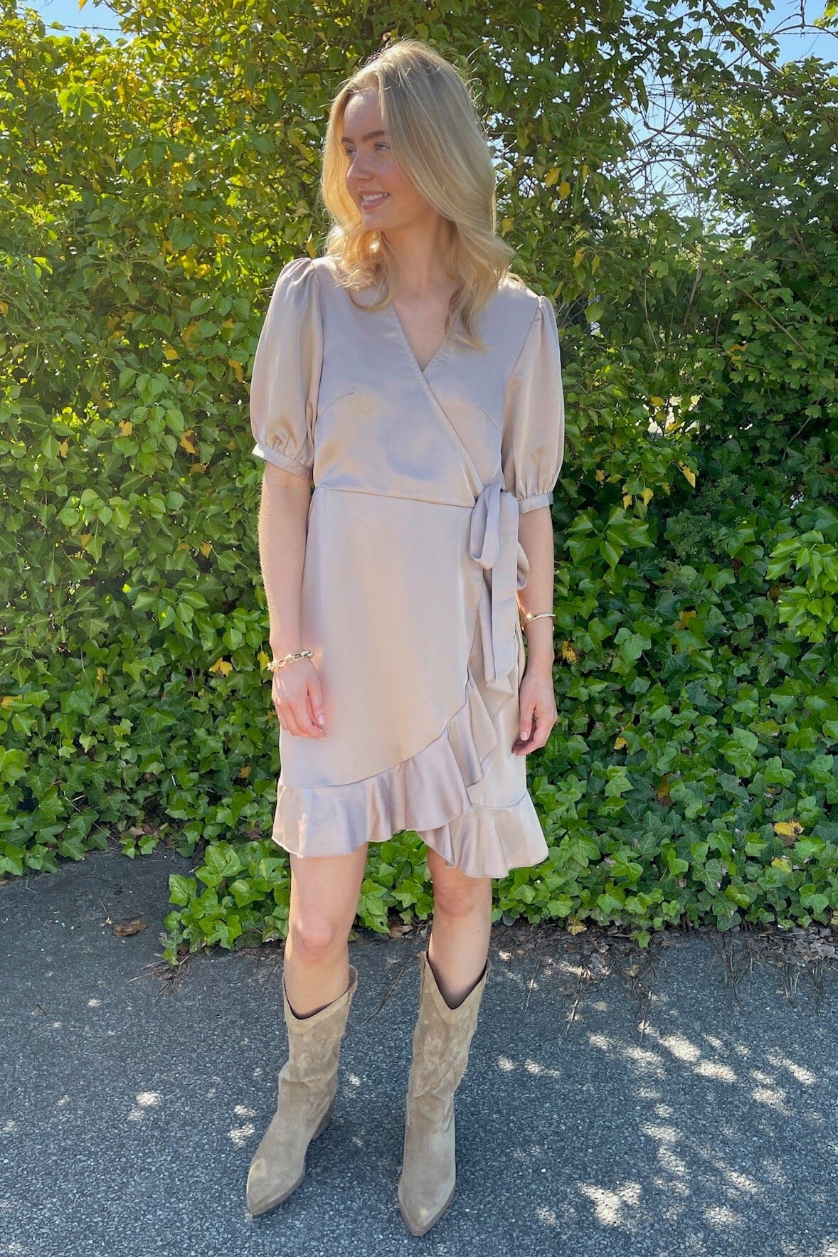 Wikkeljurk van Sisters Point in champagnekleurige satijnachtige stof. De jurk heeft pofmouwen, een volant aan de onderkant en een bindband aan de zijkant die een mooie silhouet creëert.
