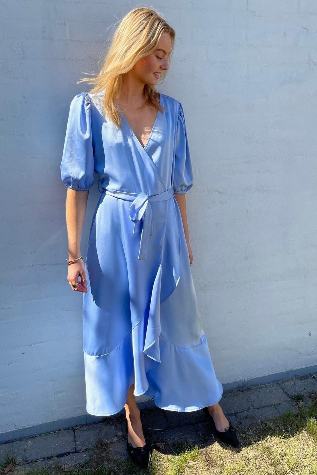 Lichtblau jurk van Sisters Point in een zachte kwaliteit. De jurk heeft een wikkelontwerp met riem en puffmouwen die een mooie silhouet geven. De gelaagde rand voegt een extra laag aan het ontwerp toe.