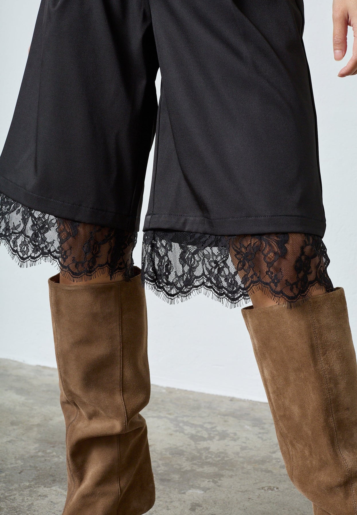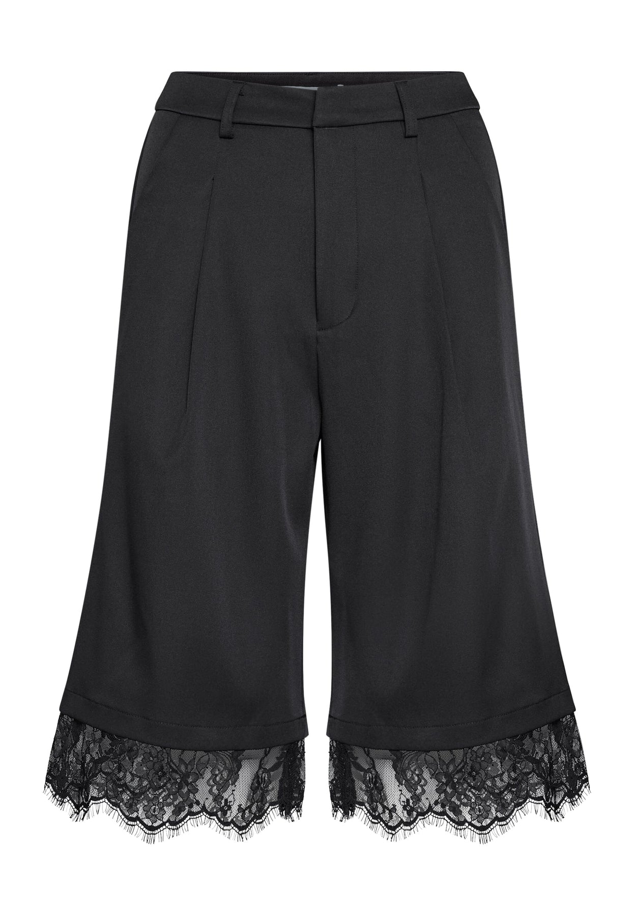 Zwarte shorts van Sisters Point met kantdetails bij de beenopeningen. De shorts hebben een losse pasvorm en vallen net over de knie.