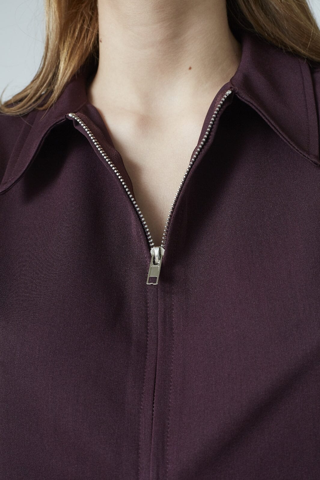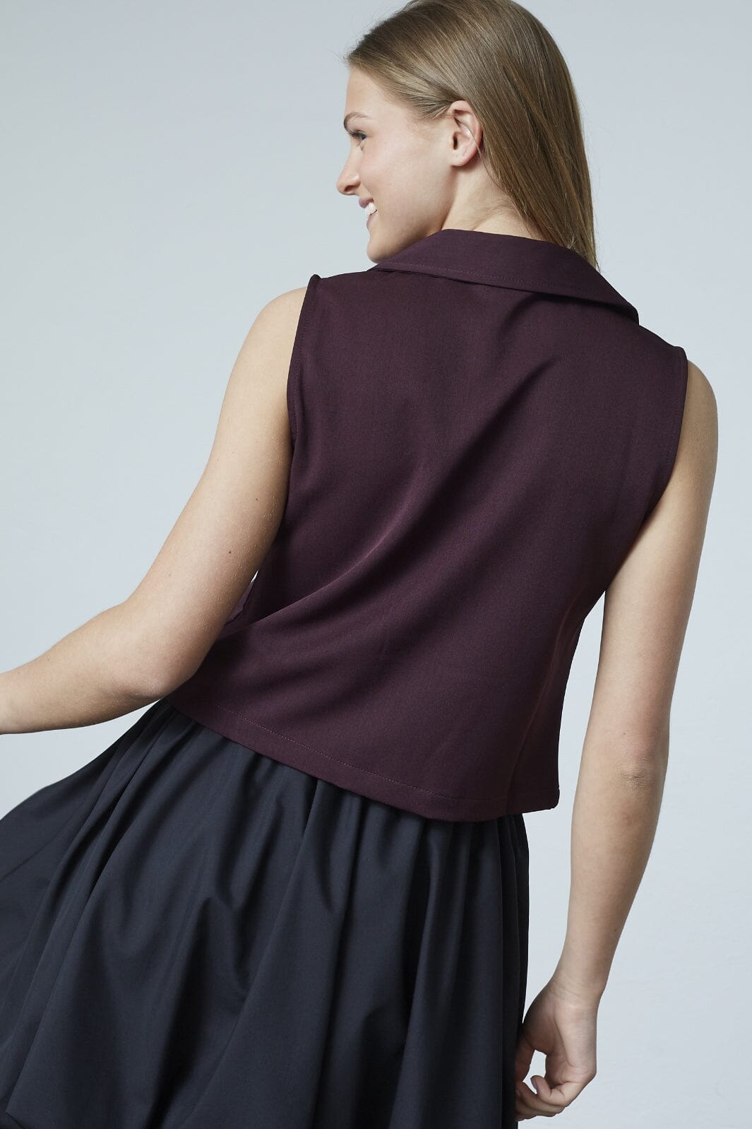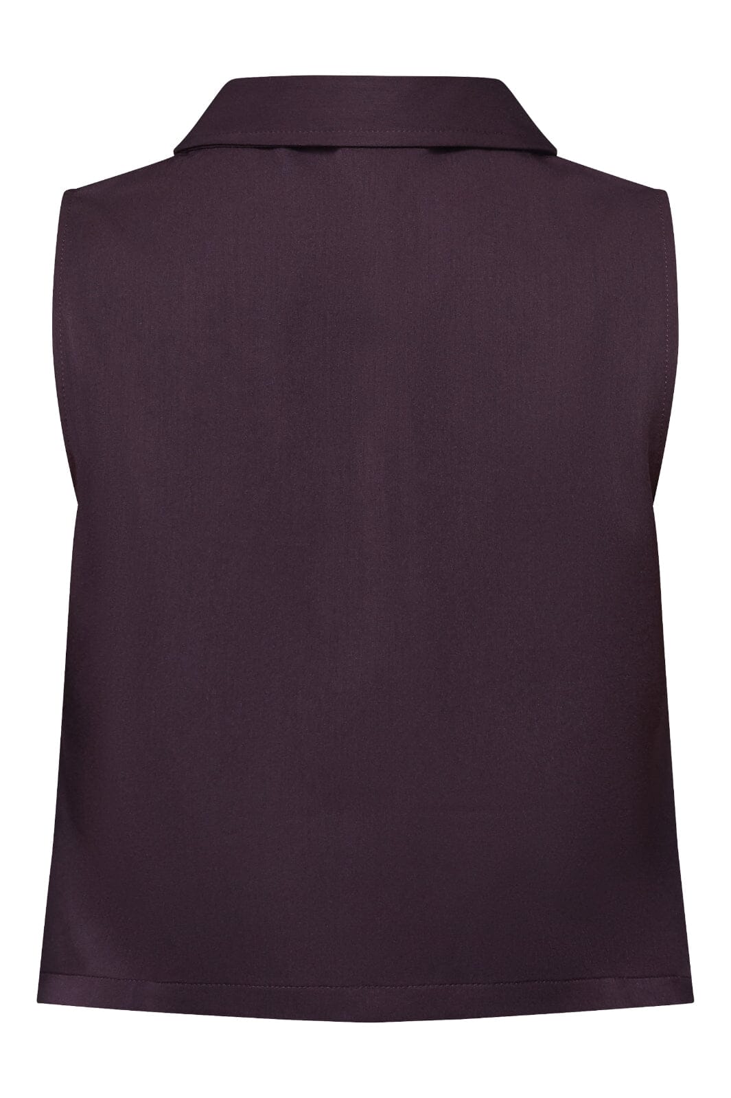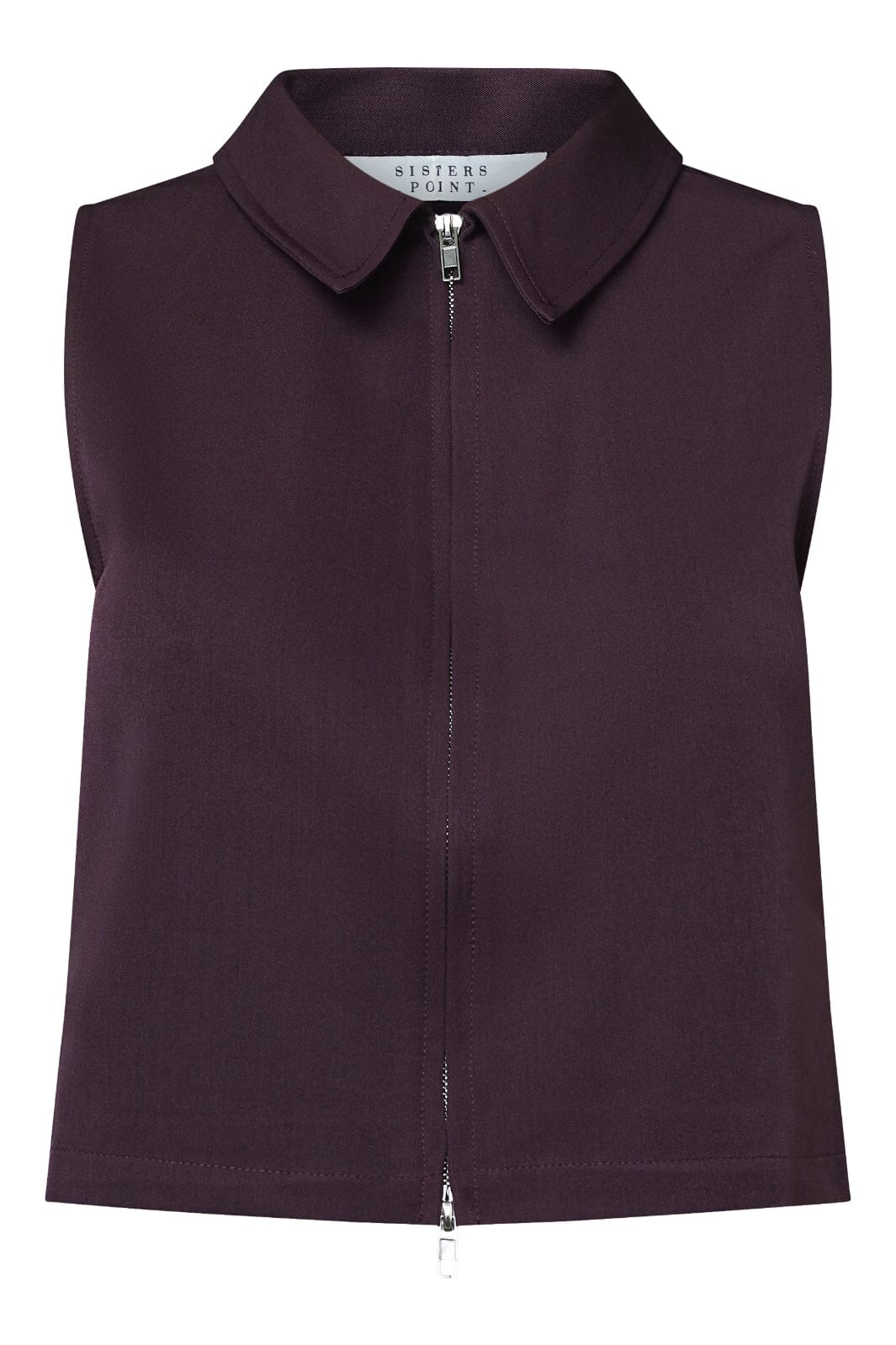 Mouwloze top van Sisters Point in bordeaux. Het heeft een overhemdkraag, een ritssluiting aan de voorkant en een aansluitende pasvorm die de lichaamslijnen benadrukt.