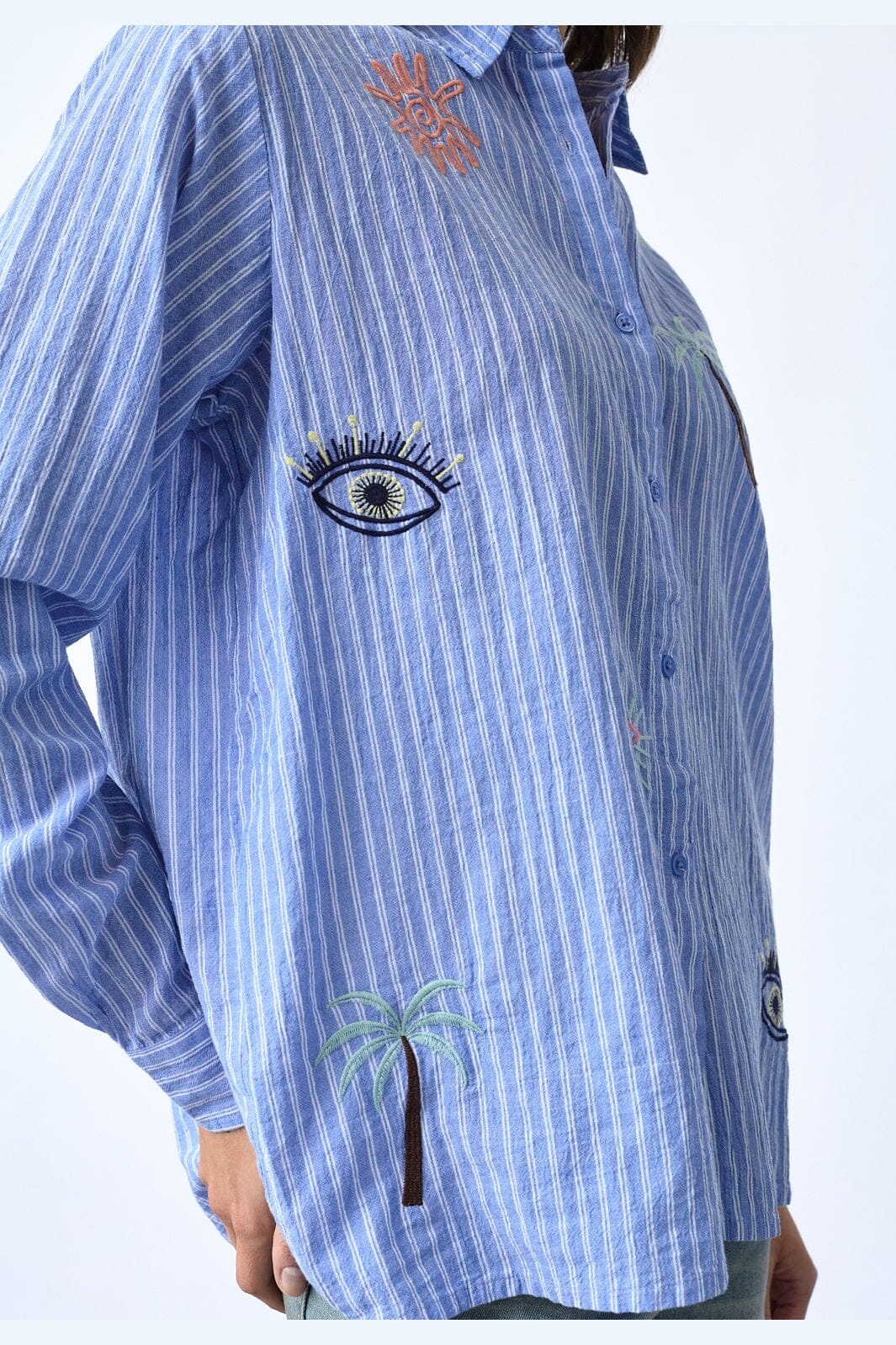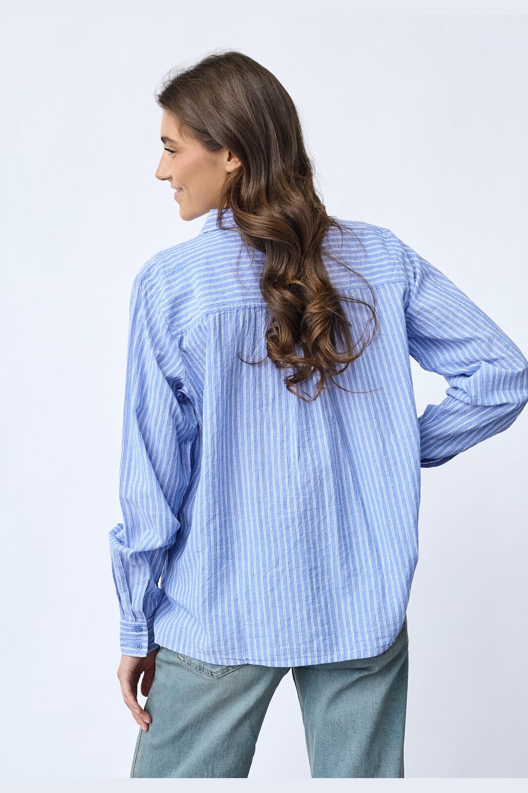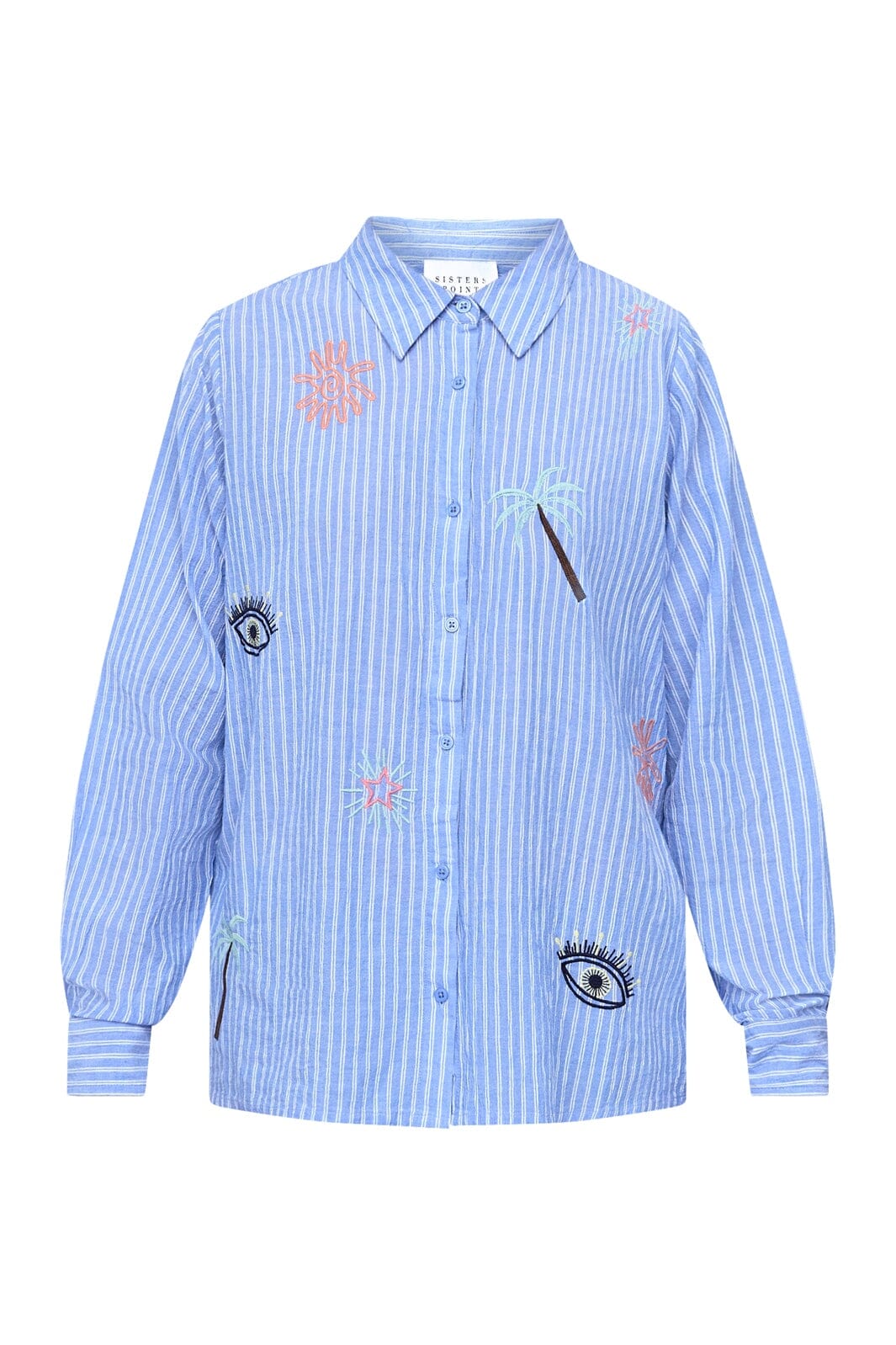 Overhemd van Sisters Point met blauwe en witte strepen. Het overhemd heeft borduursel en een losse pasvorm.
