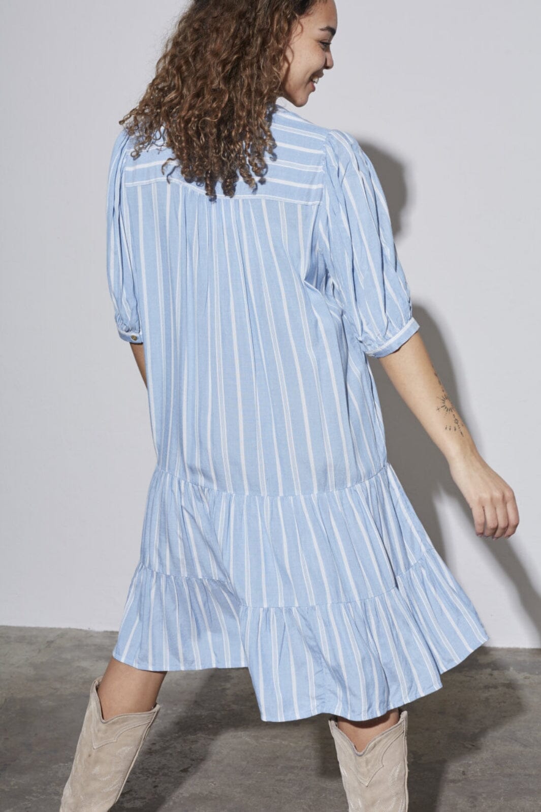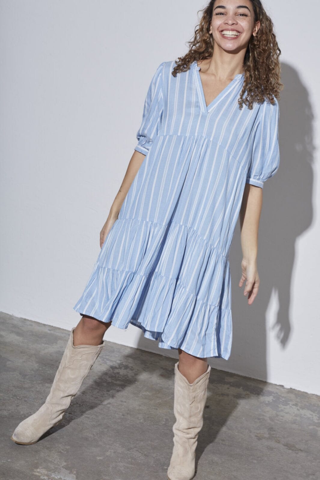Gestreepte jurk van Sisters Point in lichtblauw en crème. De jurk heeft een losse pasvorm met peplum-details en driekwartlange pofmouwen, wat een vrouwelijke uitstraling geeft.