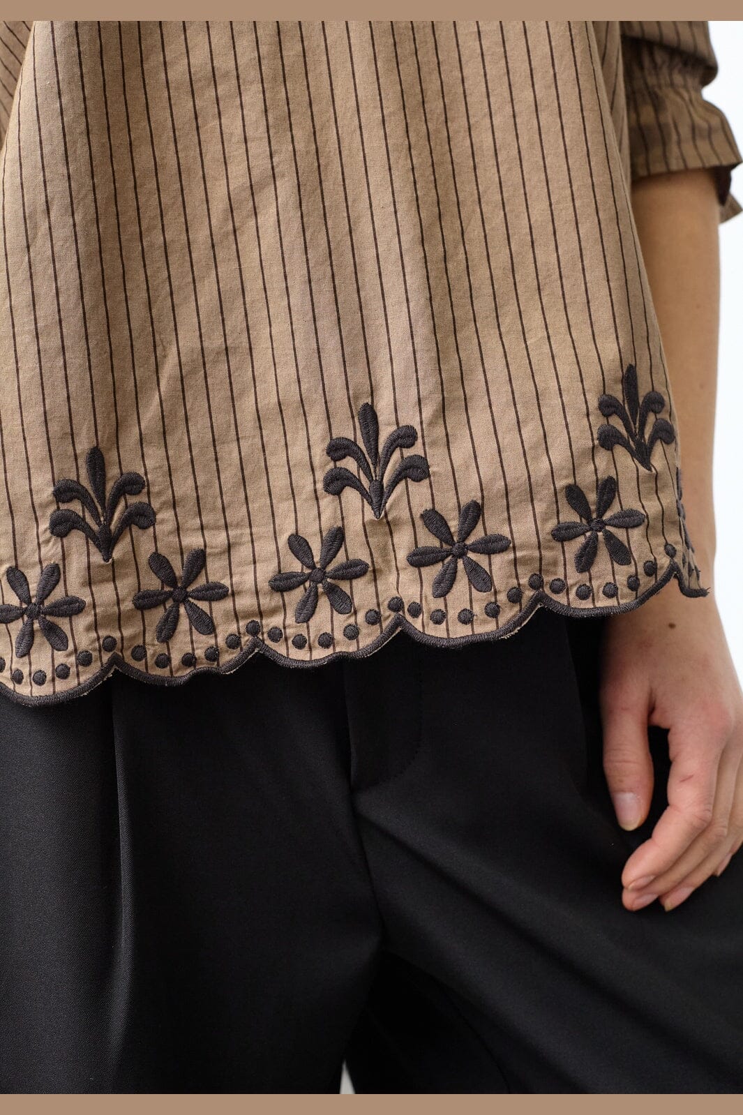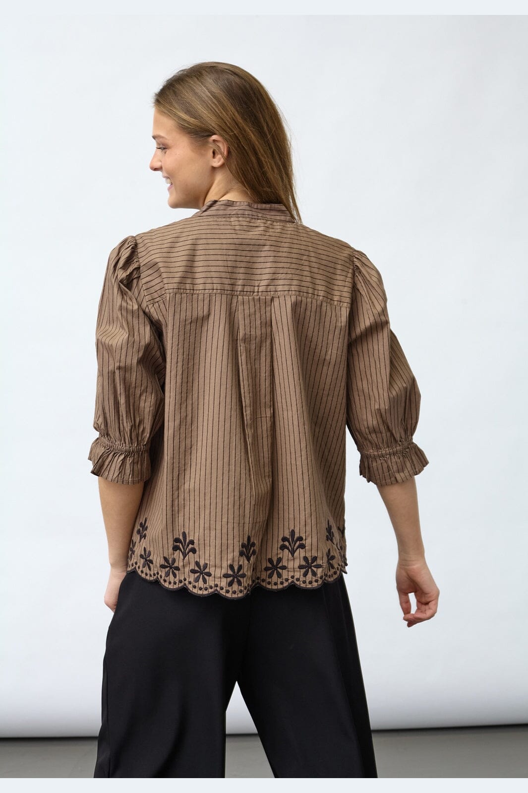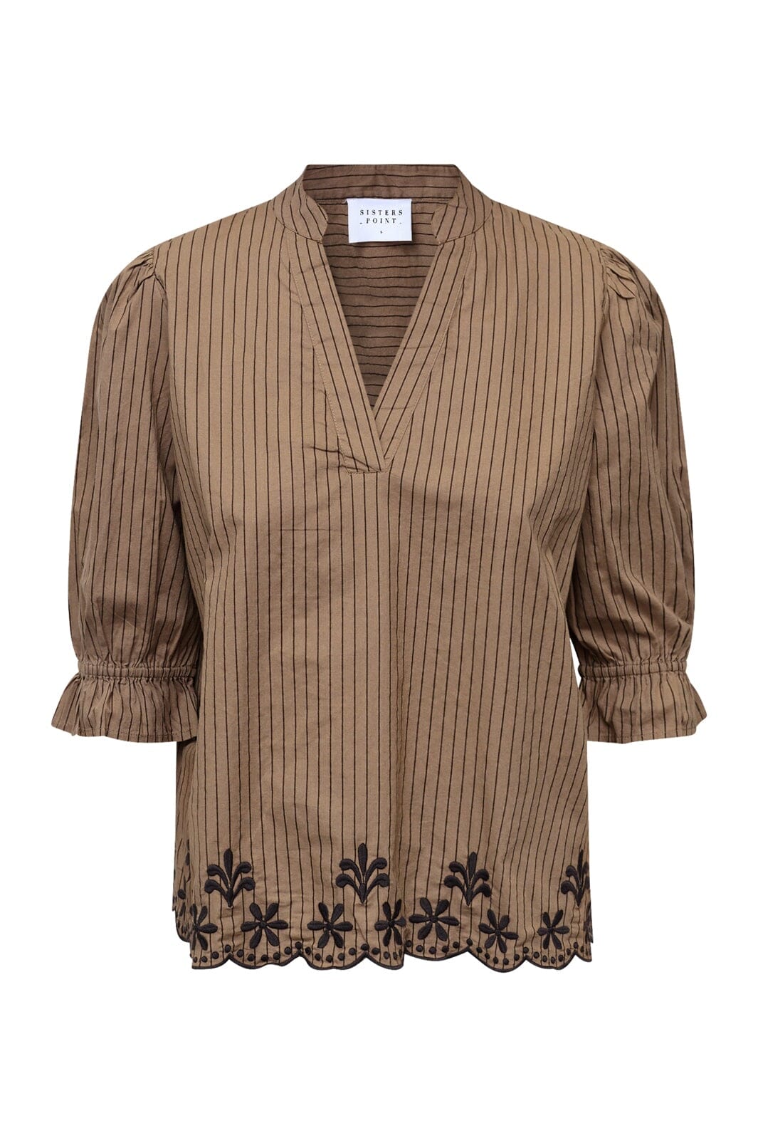 Blouse van Sisters Point met bruin gestreepte verticale lijnen en een losse pasvorm. De blouse heeft driekwartmouwen en een V-hals met een kleine kraag.