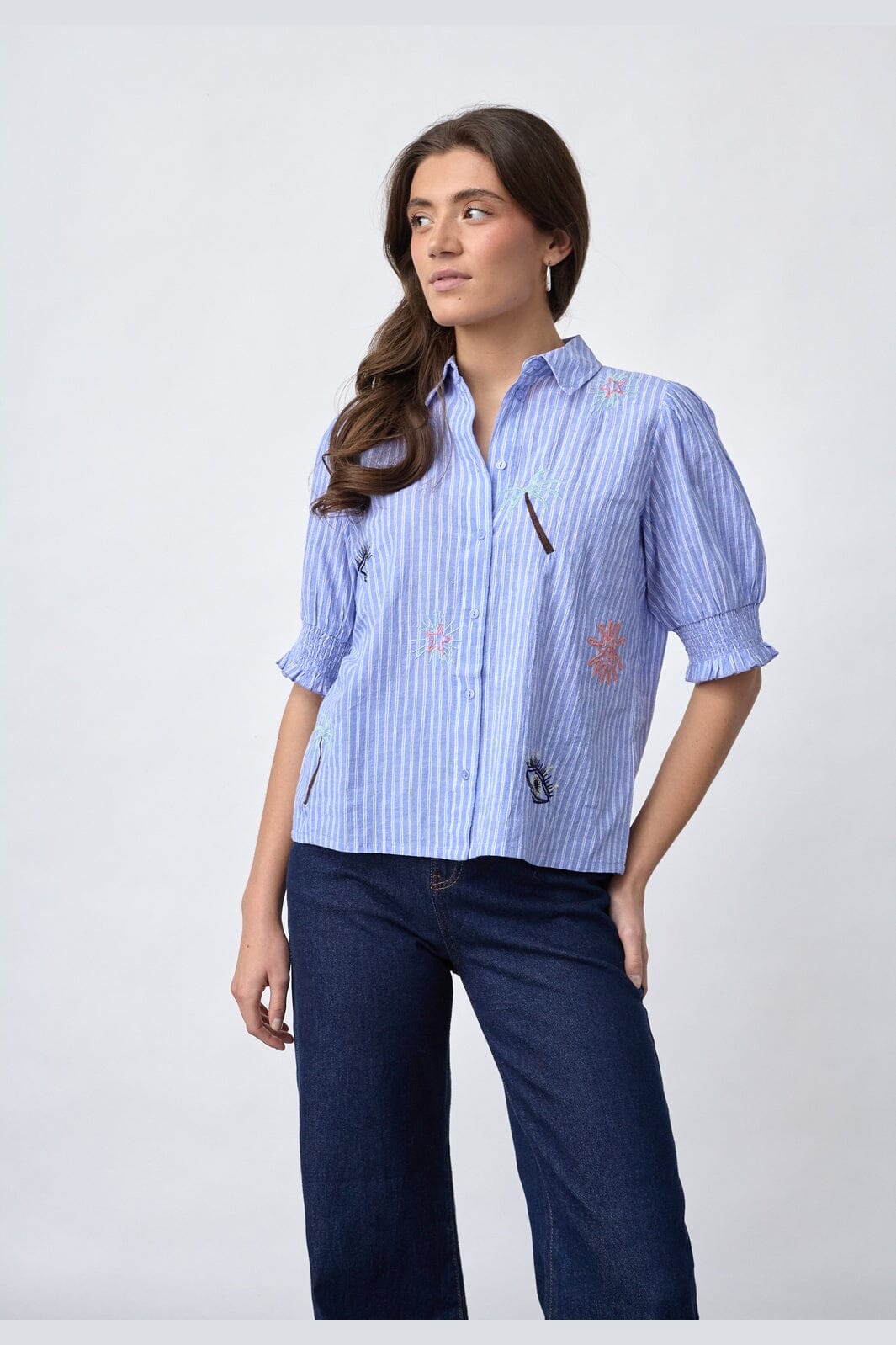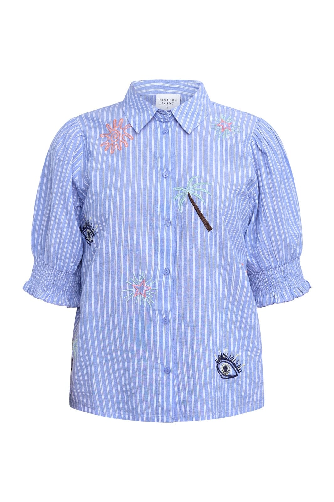 Gestreept shirt van Sisters Point met blauwe en witte strepen. Het heeft geborduurde motieven van palmbomen en zonnen op de voorkant.