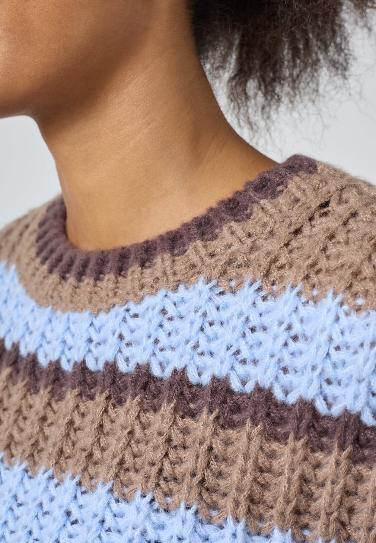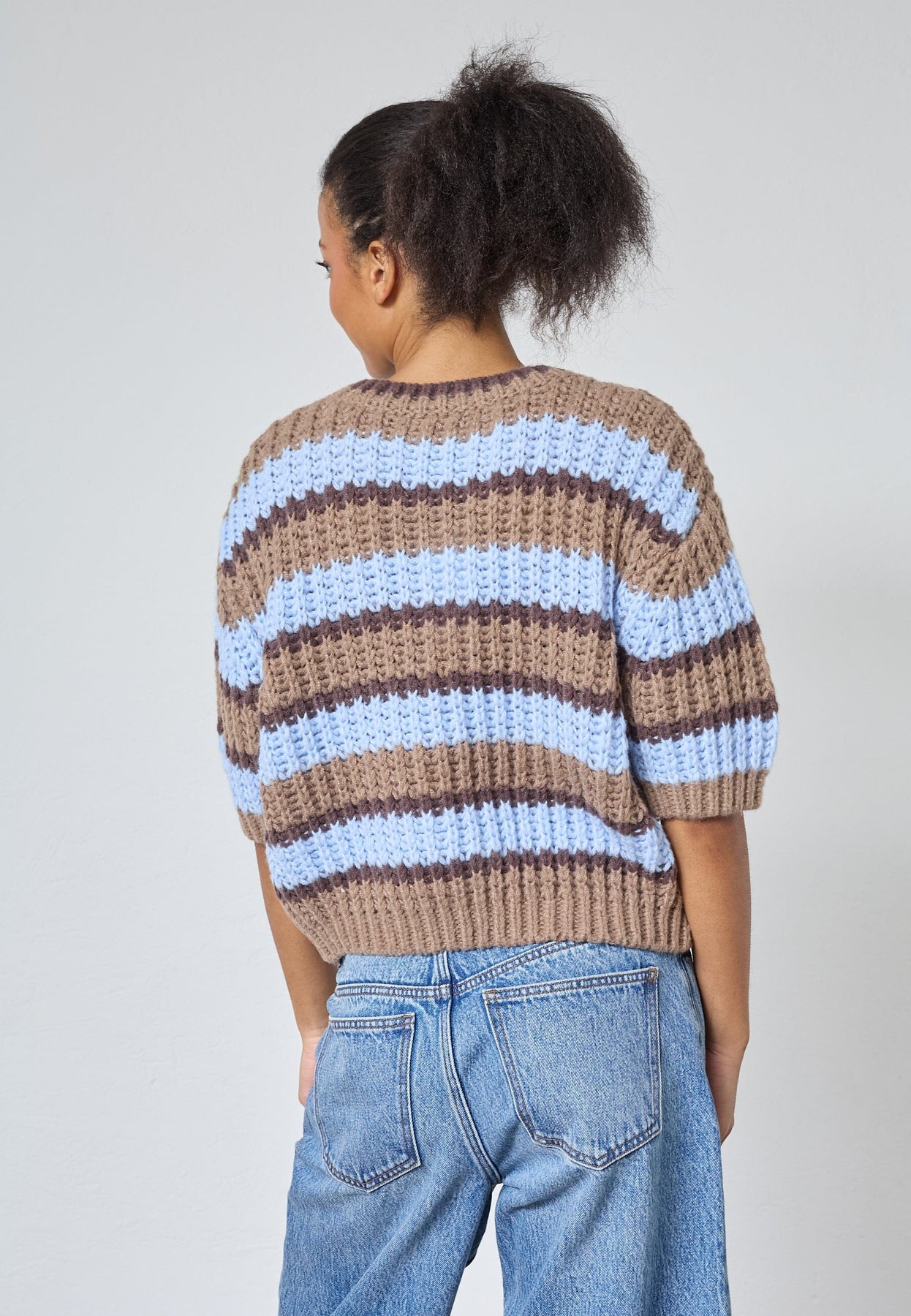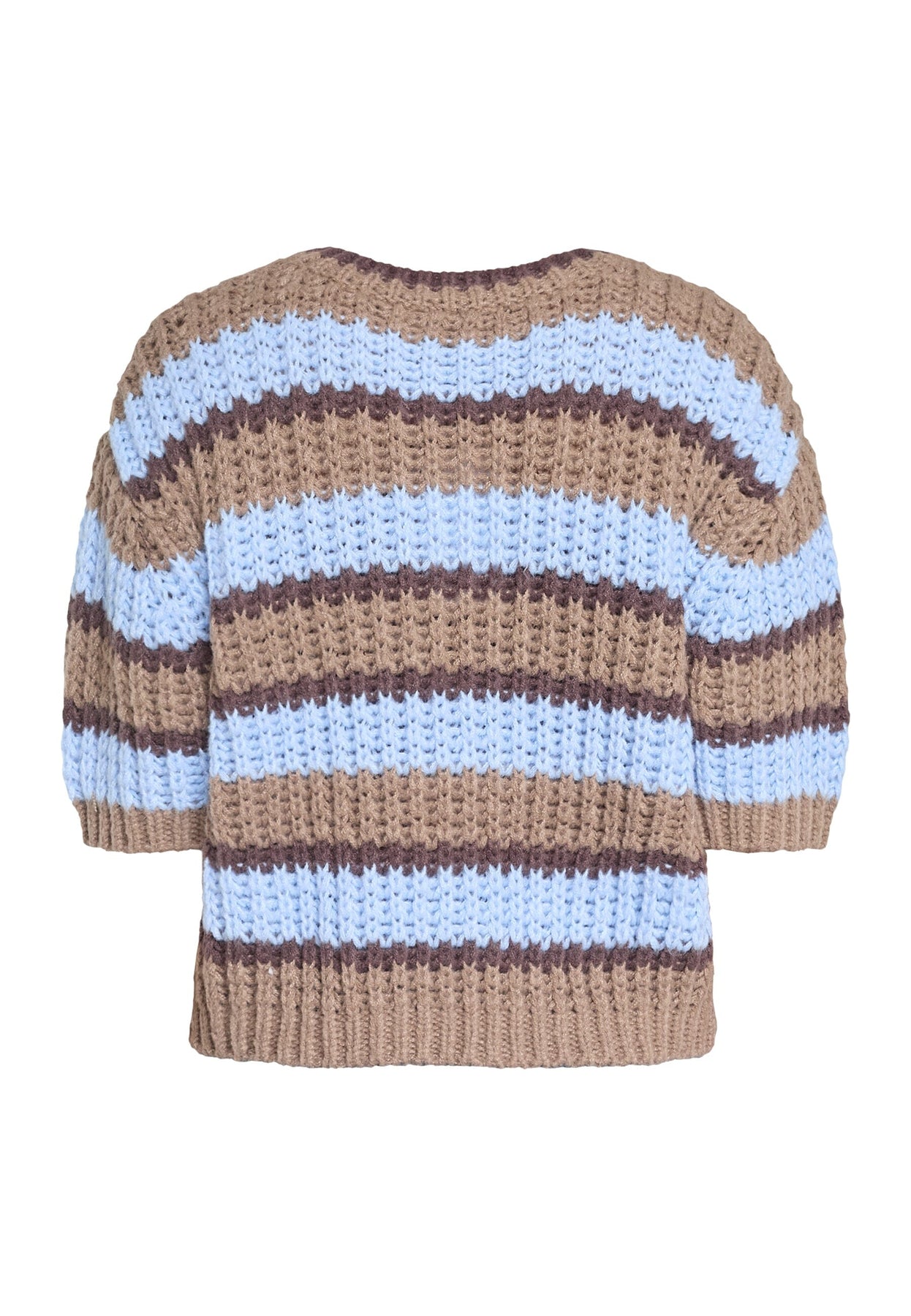 Gebreide trui van Sisters Point in lichtblauw, beige en bruin. De trui heeft horizontale strepen en een lichte, ontspannen pasvorm.