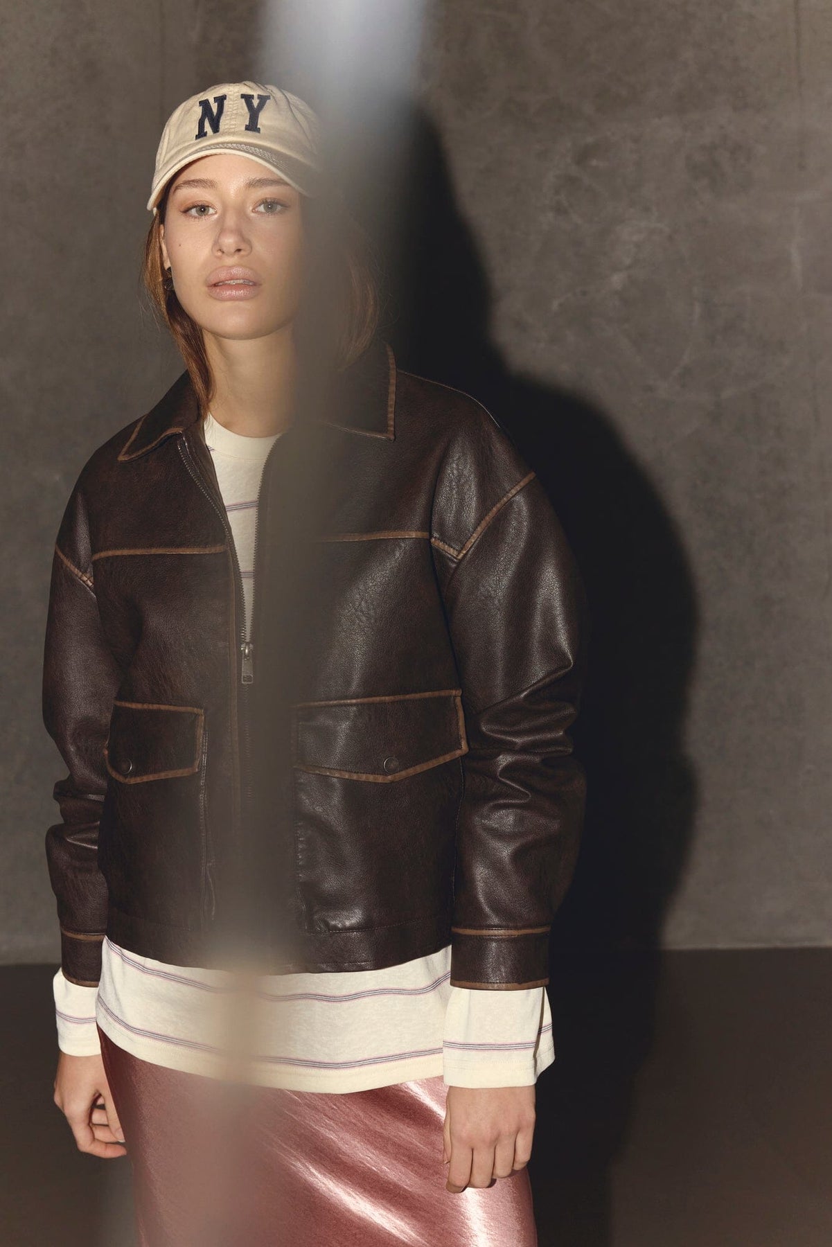 Bruin jack van imitatieleer van Sisters Point. Het jack heeft een kraag en een ritssluiting aan de voorkant met opvallende naden langs de randen.