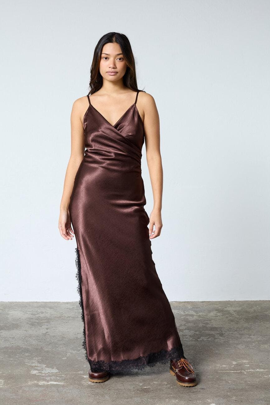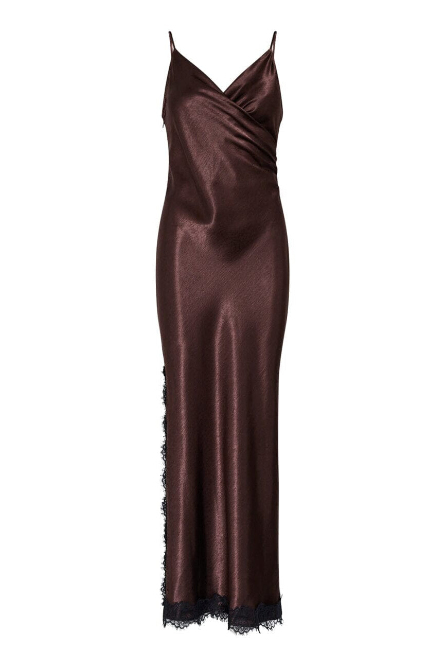 Jurk van Sisters Point in bruin en zwart met glanzende satijnen afwerking en zwarte kantdetails langs de rand en een zijsplit.